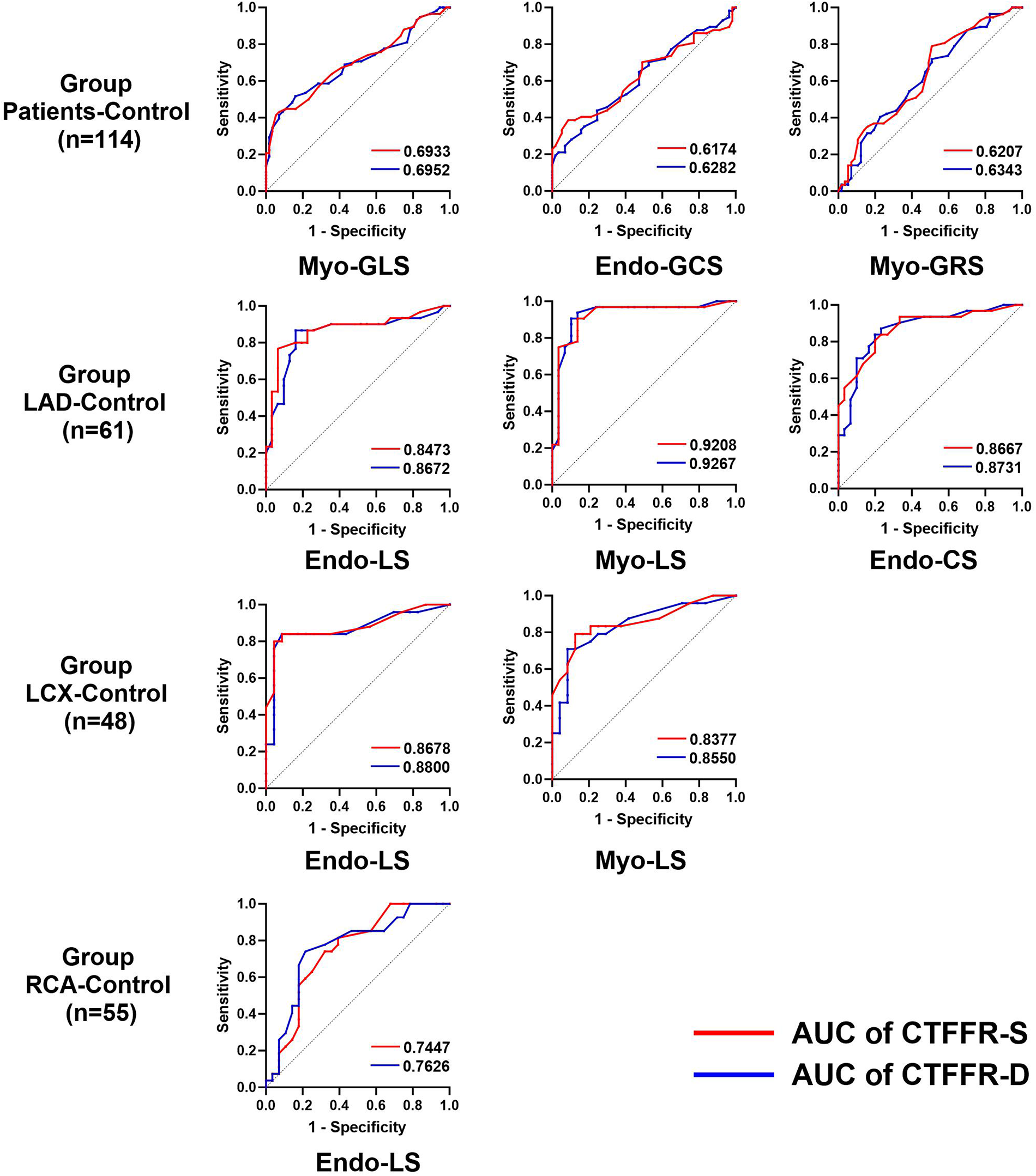 Diagnostic performance of the CTFFR to recognize impaired myocardial strain in group patients-control, group LAD-control, group LCX-control and group RCA-control.