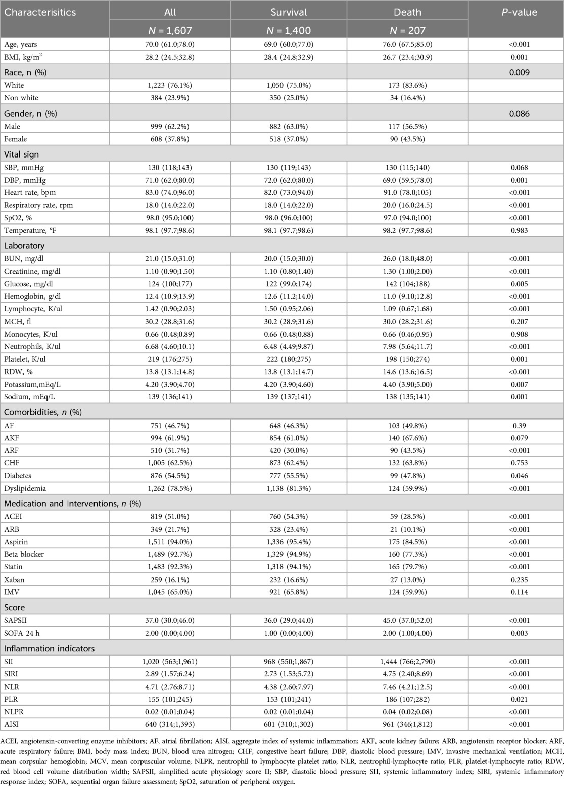 Previous studies have extensively explored the potential value of various inflammatory markers in the diagnosis and prognostic prediction of cardiovascular diseases. Among these, NLR has demonstrated strong utility in assessing both the severity and prognosis of CHD. For instance, S. Yuan et al. reported a significant association between NLR and higher Gensini scores, indicating its predictive value in evaluating the extent of coronary artery lesions in patients with acute coronary syndrome (ACS) (5). Similarly, PLR has been found to assist in risk stratification for adverse events in CHD. J. Larmann et al. observed that elevated PLR was associated with perioperative cardiovascular complications in patients with CHD (6). In addition, a meta-analysis conducted by C. Zhang et al. demonstrated that SII was independently associated with an increased risk of major adverse cardiovascular events (MACE) following percutaneous coronary intervention (PCI) in CHD patients (7). Moreover, T. Y. Zhang found that individuals with CHD exhibited higher SIRI levels (8).Y. Jiang's study revealed that the aggregate index of systemic inflammation (AISI) was an effective predictor of short-term adverse outcomes in patients with acute myocardial infarction, and was also closely associated with the incidence of new-onset atrial fibrillation and contrast-induced nephropathy (9). Other studies have identified an independent association between NLPR and poor short-term prognosis in CHD patients admitted to the ICU, suggesting a potential prognostic value of NLPR in critical care settings (10). Additionally, elevated RDW is independently and incrementally associated with mortality risk among patients with CHD, a relationship that may reflect chronic or abnormal inflammatory conditions (11). Y. Cheng et al. integrated these inflammatory indices to further investigate their association with in-hospital and short-term mortality risks in ICU patients with CHD. Their findings indicated that all aforementioned inflammatory markers were independent predictors of short-term mortality in this population (10).