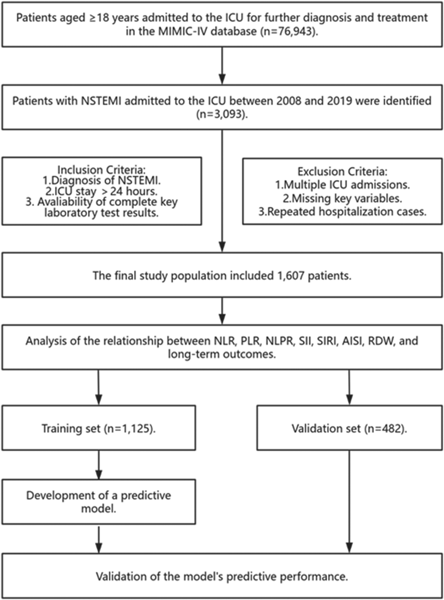 Therefore, the main objectives of our study are to elucidate the correlations of various composite inflammatory indices (including NLR, PLR, SII, SIRI, AISI, NLPR, and RDW) with long-term prognosis in severe NSTEMI individuals in the ICU, identify significant markers, develop a novel prognostic prediction model, and evaluate its predictive performance.