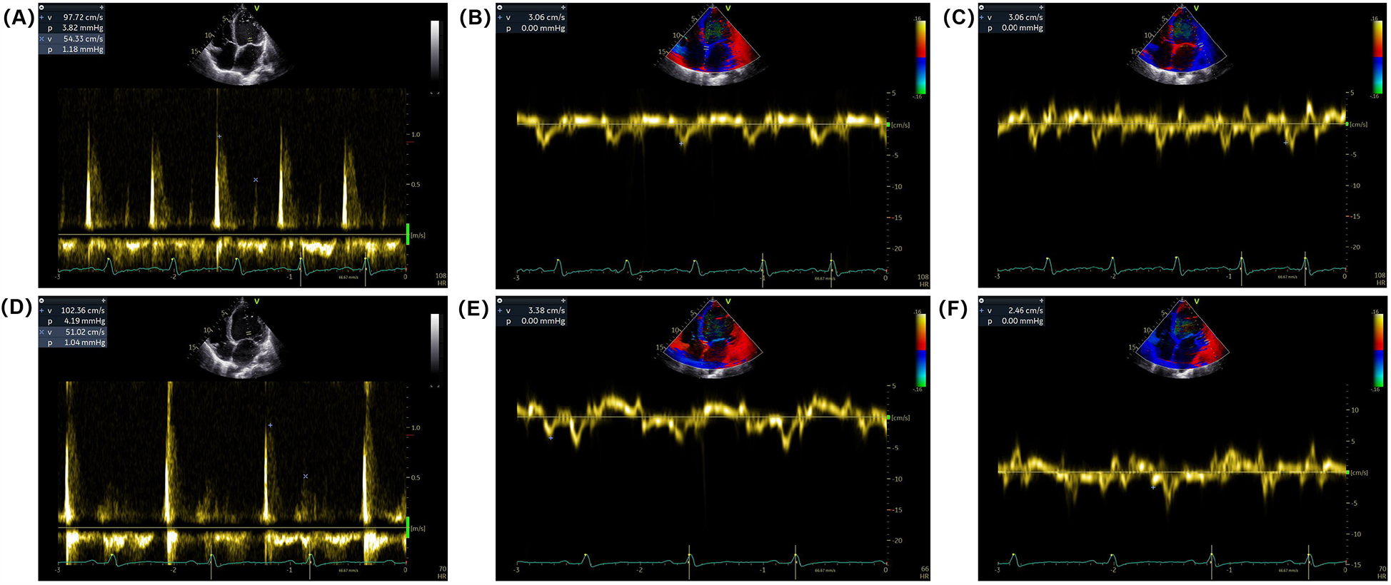 Mitral inflow and tissue Doppler imaging for diastolic function assessment. (A) Pulsed-wave Doppler recordings of mitral inflow showing (E,A) waves at admission. (B,C) Tissue Doppler imaging of the mitral annulus showing early diastolic velocity (e’) at the septal and lateral annulus at admission. (D) Pulsed-wave Doppler recordings of mitral inflow showing (E,A) waves at discharge. (E,F) Tissue Doppler imaging of the mitral annulus showing early diastolic velocity (e’) at the septal and/or lateral annulus at discharge.