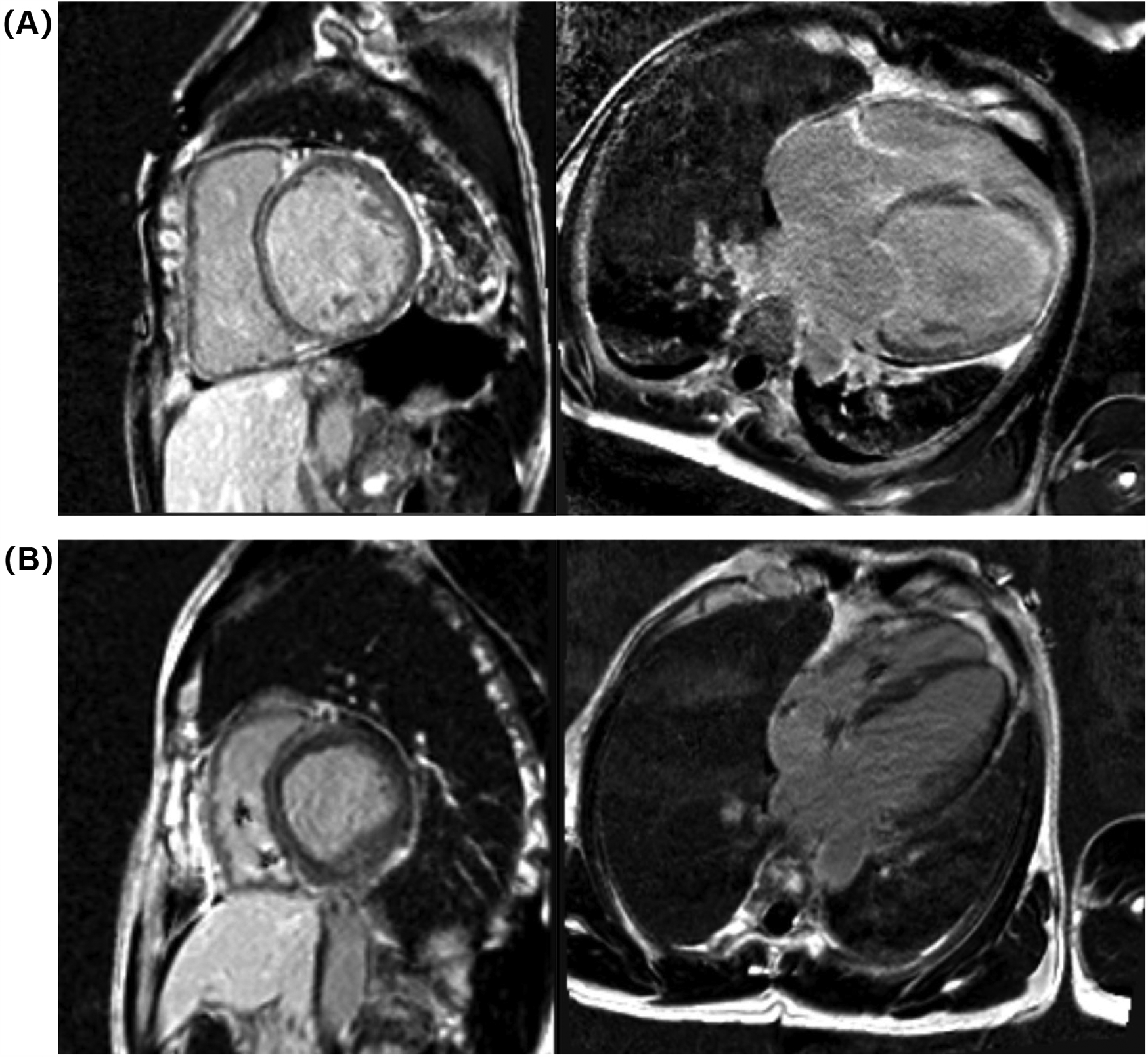 Cardiac MRI images at admission (A) and 1-year follow-up (B).