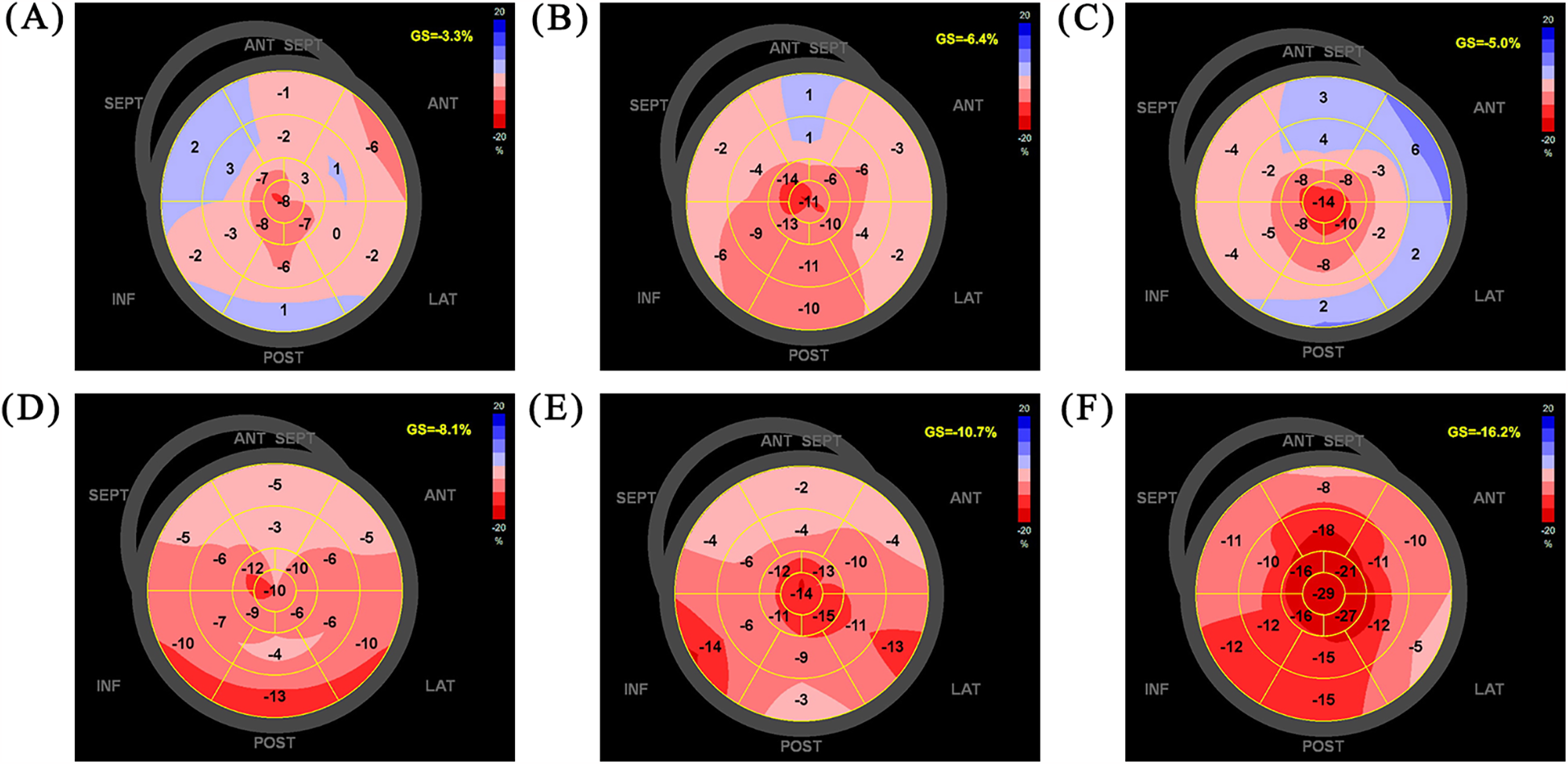 LVGLS on admission (A), postoperative day 7 (B), follow-up 1 m (C), follow-up 3 m (D), follow-up 6 m (E), follow-up 12 m (F) LVGLS, left ventricular global longitudinal strain.