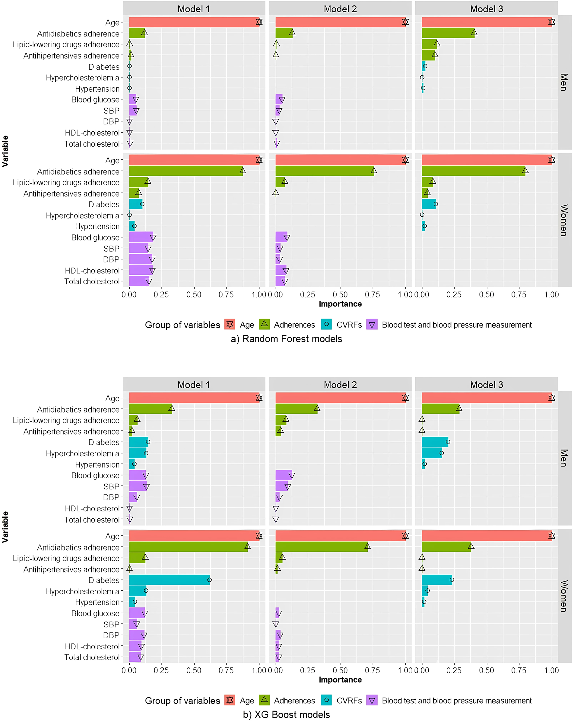 The follow-up period of the study was from 2018 to 2020. For each algorithm, 3 models were generated, including age and different combinations of three groups of variables: blood test and blood pressure measurements; CVRFs; and medication adherence.
