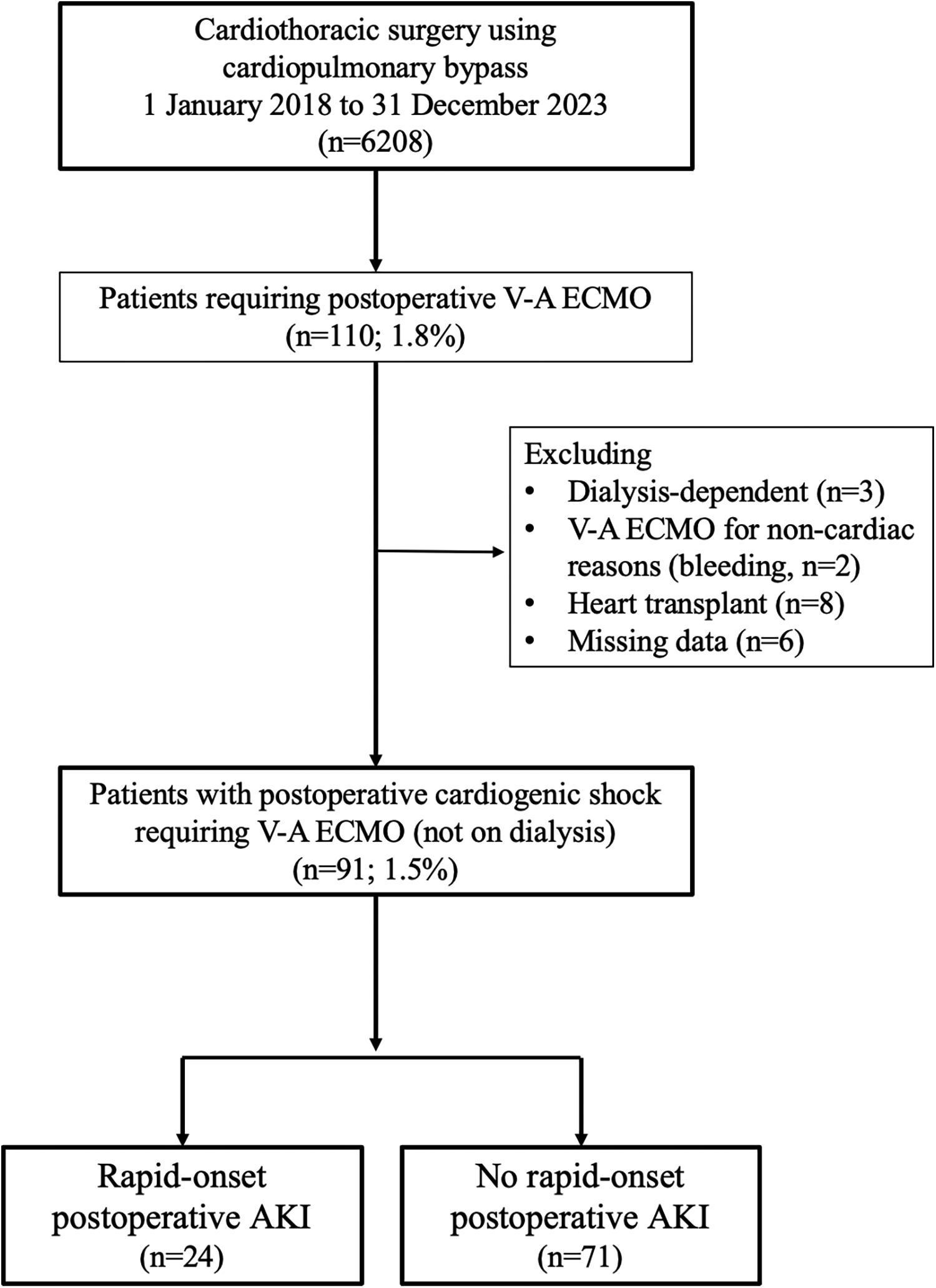 This study was a single-center retrospective analysis conducted between January 2013 and December 2023, with data collection carried out in October 2024. A total of 6,208 patients underwent cardiothoracic surgery using cardiopulmonary bypass. 110 patients required postoperative V-A ECMO. After excluding patients who were dialysis-dependent preoperatively (n = 3), received V-A ECMO for non-cardiac indications (n = 2), underwent heart transplantation (n = 8), or had missing postoperative clinical data (n = 2), 95 patients remained for analysis as those experiencing postoperative cardiogenic shock requiring V-A ECMO (Figure 1). No major changes were made to the overall surgical techniques employed at our institution during the study period. The basic composition of the cardioplegia solution was consistently extracellular type, mixed with blood at a ratio of either 1:1 or 3:1. Cardioplegia was administered under hypothermia at 14°C for aortic procedures, while tepid cardioplegia at 29°C was used for other cases during the study period. AKI was defined according to the KDIGO criteria.