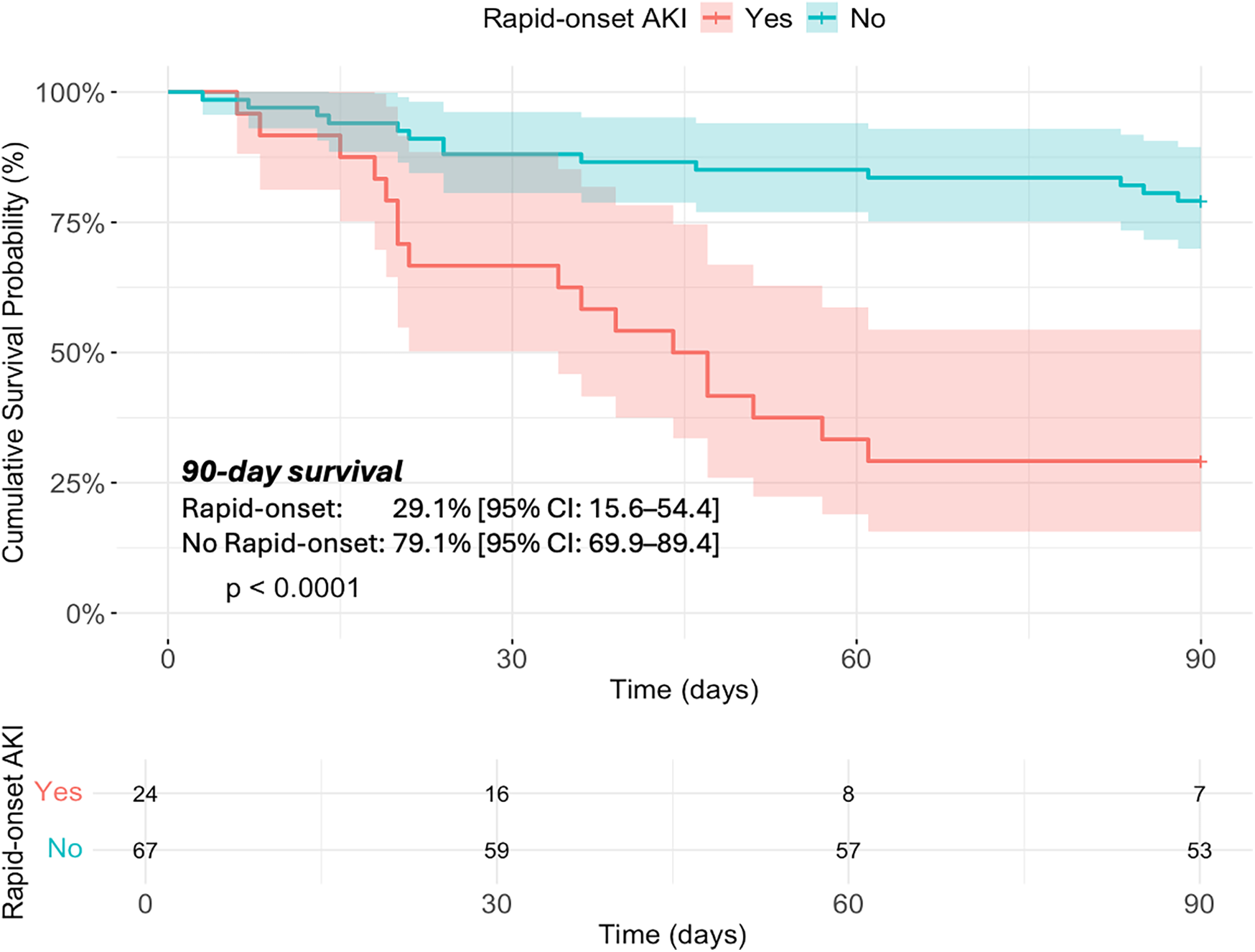 Twenty-four patients (26.4%) were classified as rapid-onset AKI. The median age, primary diagnosis, and preoperative serum creatinine levels were similar between groups. However, the rapid-onset AKI group had a preoperative lower left ventricular ejection fraction (42.5% vs. 60.0%, p = 0.006), longer cardiopulmonary bypass time (332 vs. 245 min, p = 0.009), and a longer duration of mechanical circulatory support (6.0 vs. 2.0 days, p = 0.001). The success rate of weaning from mechanical circulatory support was lower (61.1% vs. 93.3%, p = 0.002), and the 90-day cumulative survival probability was lower in the rapid-onset AKI group (29.1% [95% confidence interval (CI): 15.6–54.4 vs. 79.1% [95% CI: 69.9–89.4], p < 0.001). Cox regression analysis confirmed an independent association between rapid-onset AKI and 90-day mortality (adjusted hazard ratio: 3.15, 95% CI: 1.38–7.19, p = 0.006).