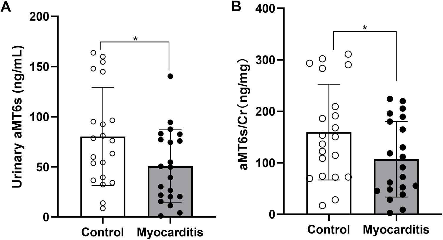 Comparison of aMT6s concentration and normalized to urinary creatinine levels (expressed as aMT6s/Cr ratio) between the acute myocarditis group and the healthy control group. Data are presented as mean ± SD. (A) Urinary aMT6s concentration was significantly lower in the acute myocarditis group compared with controls (P = 0.031, t-test; Cohen's d = 0.691, 95% CI: 0.064–1.310). (B) The aMT6s-to-creatinine ratio was also reduced in myocarditis patients (P = 0.048, t-test; Cohen's d = 0.630, 95% CI: 0.006–1.247). *p < 0.05 compared to the Control group.