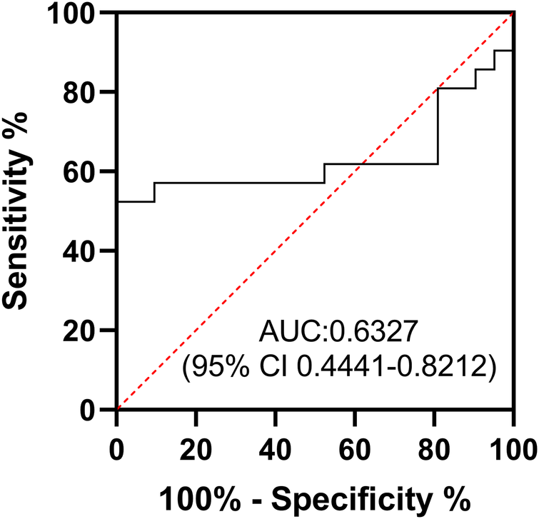 Receiver operating characteristic (ROC) curve of aMT6s/Cr. The diagnostic performance of morning urinary creatinine-corrected aMT6s for acute myocarditis (AUC = 0.63, 95% CI: 0.4441–0.8212).