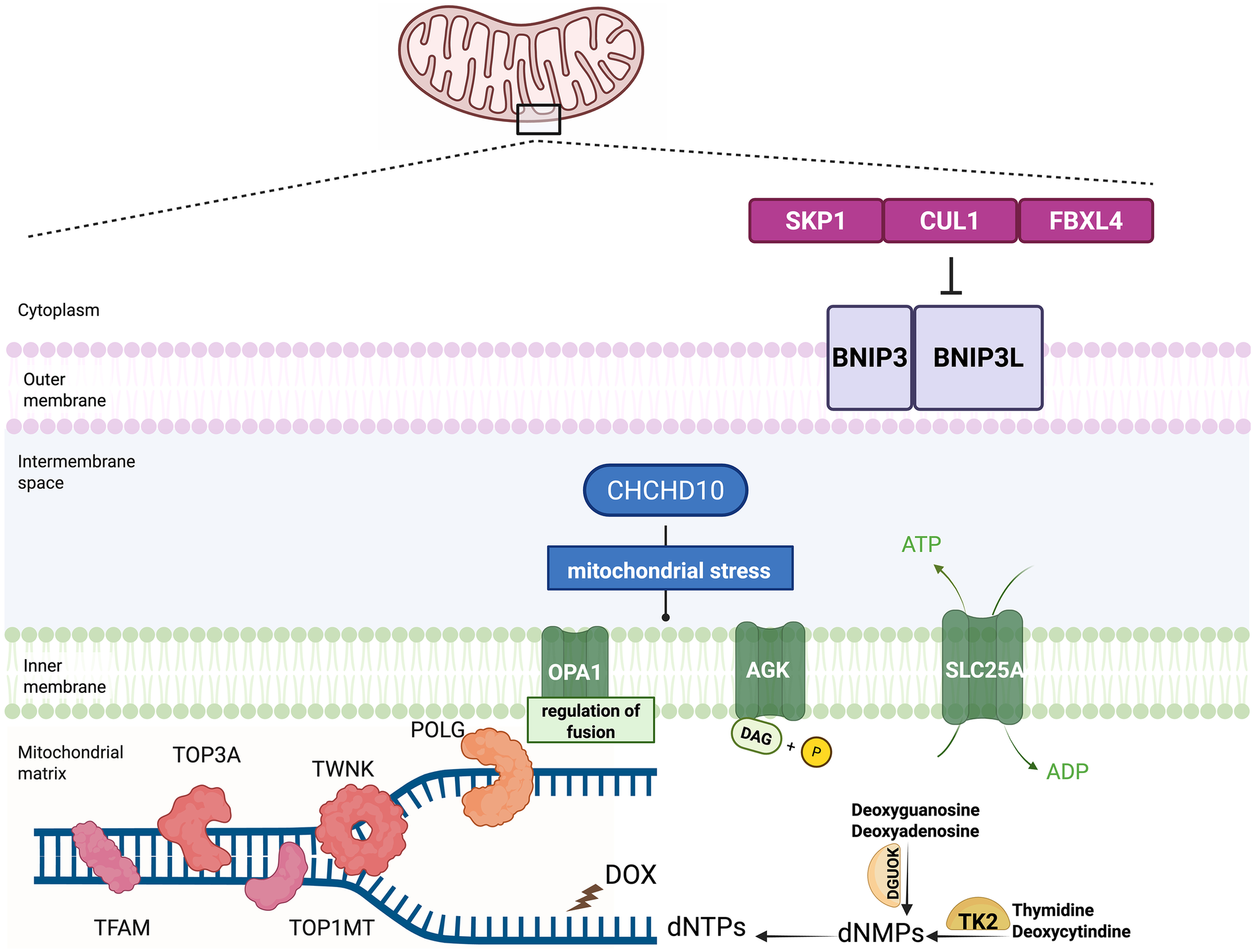 Model of pathogenesis involved in the mitochondrial depletion syndrome and the circumstance of doxorubicin mimicking the mitochondrial depletion syndrome. Dysfunctional mtDNA maintenance, nucleotide imbalance, and mitochondrial dynamics contribute to the mitochondrial depletion syndrome. The crucial proteins participating in the mitochondrial DNA maintenance include POLG, TWNK, TFAM, TOP3A and TOP1MT. Nucleotide metabolism plays a crucial role in the development of the MTDPS as well. Two key enzymes in the nucleotide salvage pathway, TK2 and DGUOK, are responsible for maintaining the mitochondrial dNTP pools. Mitochondrial dynamics are essential for maintaining the mitochondrial function. The proteins participating in the mitochondrial fusion, fission, and transport include OPA1 and AGK. FBXL4 serves as a component of E3 ubiquitin ligase complexes, called SKP1-CUL1-F-box (SCF) complexes. The SCF-FBXL4 E3 ubiquitin ligase complexes function as the suppressor of the mitophagy by mediating the degradation of BNIP3 and BNIP3l mitophagy receptors. FBXL4 functions to protect mitochondria from the depletion by inhibiting the mitophagy. Doxorubicin (DOX), widely used in oncology, could disrupt mitochondrial homeostasis by depleting mtDNA mimicking MTDPS.
