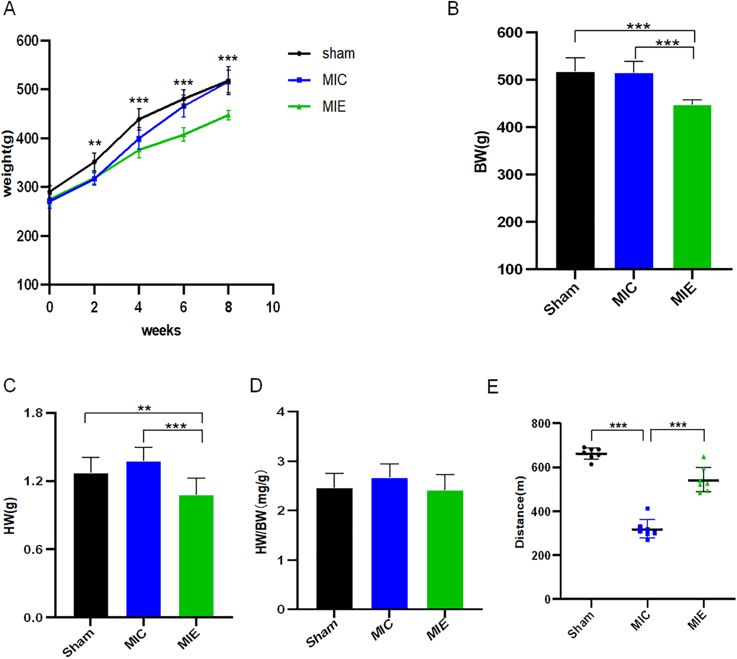 The rats in the exercise group showed a slower increase in body weight compared to the MIC group starting from 4 weeks of exercise, and this trend persisted through 8 weeks. At 4 weeks, BW was significantly lower in the MIE group compared to the MIC group (375.84 ± 16.26 g vs. 399.30 ± 22.07 g, P = 0.015). By 8 weeks, this difference became more pronounced (447.35 ± 10.02 g vs. 515.88 ± 23.58 g, P < 0.001). Heart weight (HW) was lower in the MIE group compared to both the Sham and MIC groups (P < 0.01). However, the heart weight-to-body weight ratio (HW/BW) was similar across the three groups. The treadmill-based exercise exhaustion test revealed that the running distance was significantly longer in the MIE group compared to the MIC group (P < 0.001) (Figure 1).