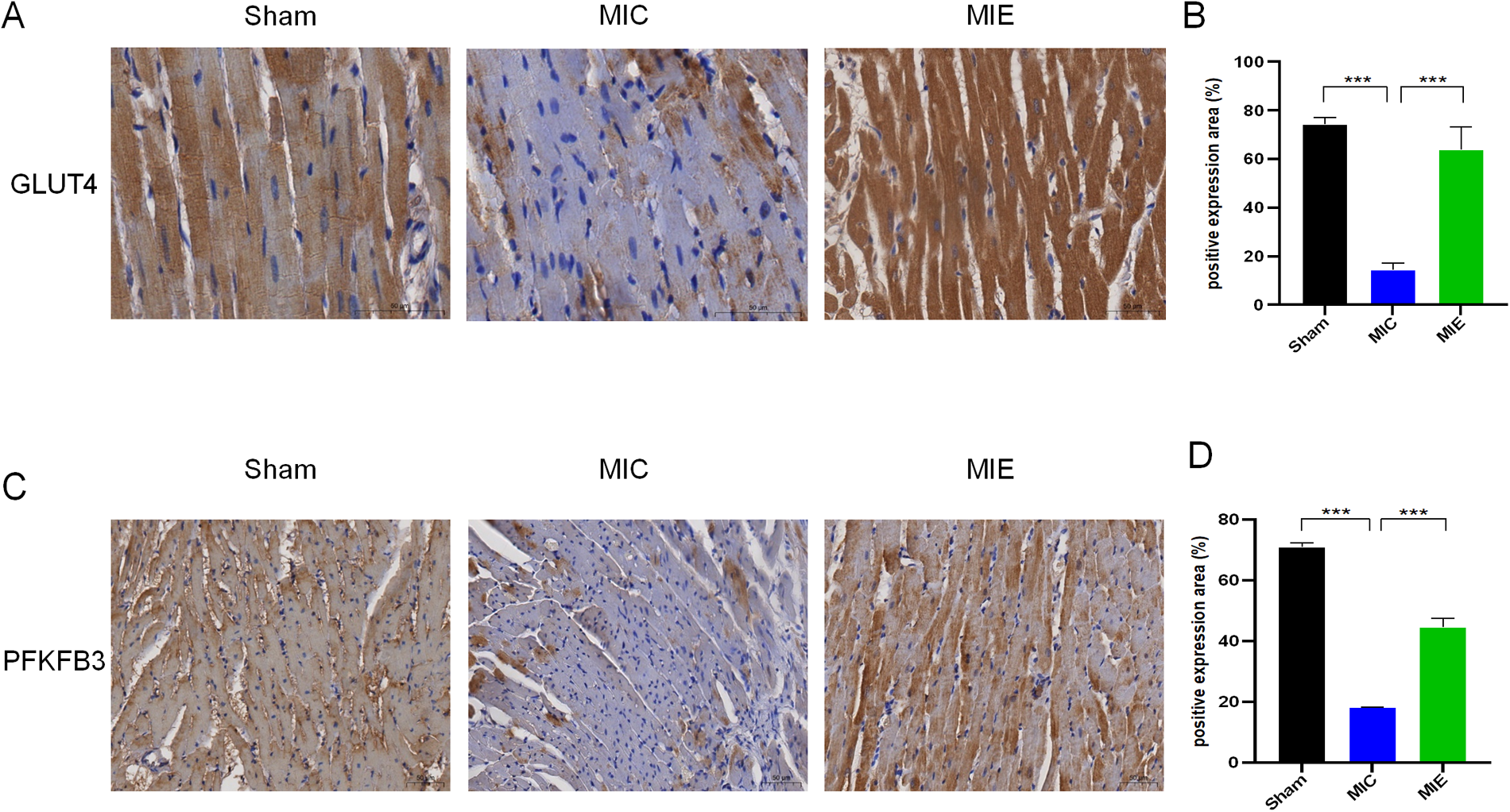 Effects of exercise on the expressions of GLUT4 and PFKFB3 in myocardial tissues of rats after 8 weeks of exercise training. (A,C) Representative micrographs of heart sections from the ischemic border zones of the three groups. (B,D) Protein expressional levels of GLUT4 and PFKFB3 in the Sham, MIC and MIE groups. n = 4 rats per group. ***P < 0.001.
