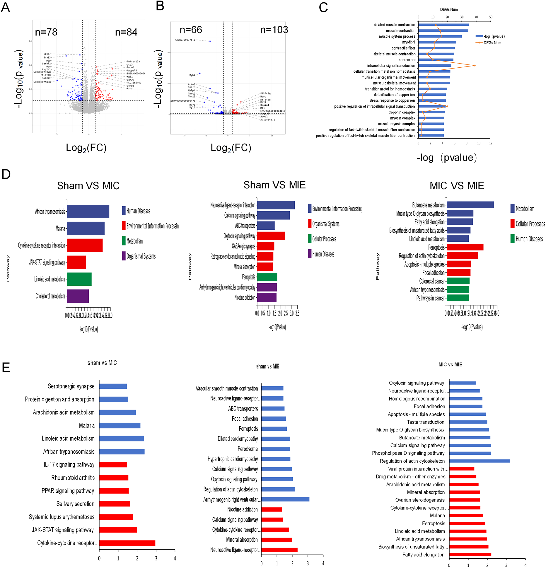 Results from RNA-Seq of myocardial tissue. (A,B) Volcano plots showing different expression genes (DEGs) between Sham and MIC, MIC and MIE respectively. (C) Twenty significantly enriched categories were identified through functional enrichment analysis of gene ontology (GO). Red line: Number of DEGs. Bars: Significance level. (D) The most highly significant pathways differentially regulated in metabolic pathways and cellular processes among the three groups. (E) KEGG enrichment analysis of metabolism pathways for genes showing upregulation (red) and downregulation (blue) in Sham, MIC and MIE rats. For volcano plots, grey represents nonsignificant, red indicates upregulated genes with P < 0.05, blue indicates downregulated genes with P < 0.05.