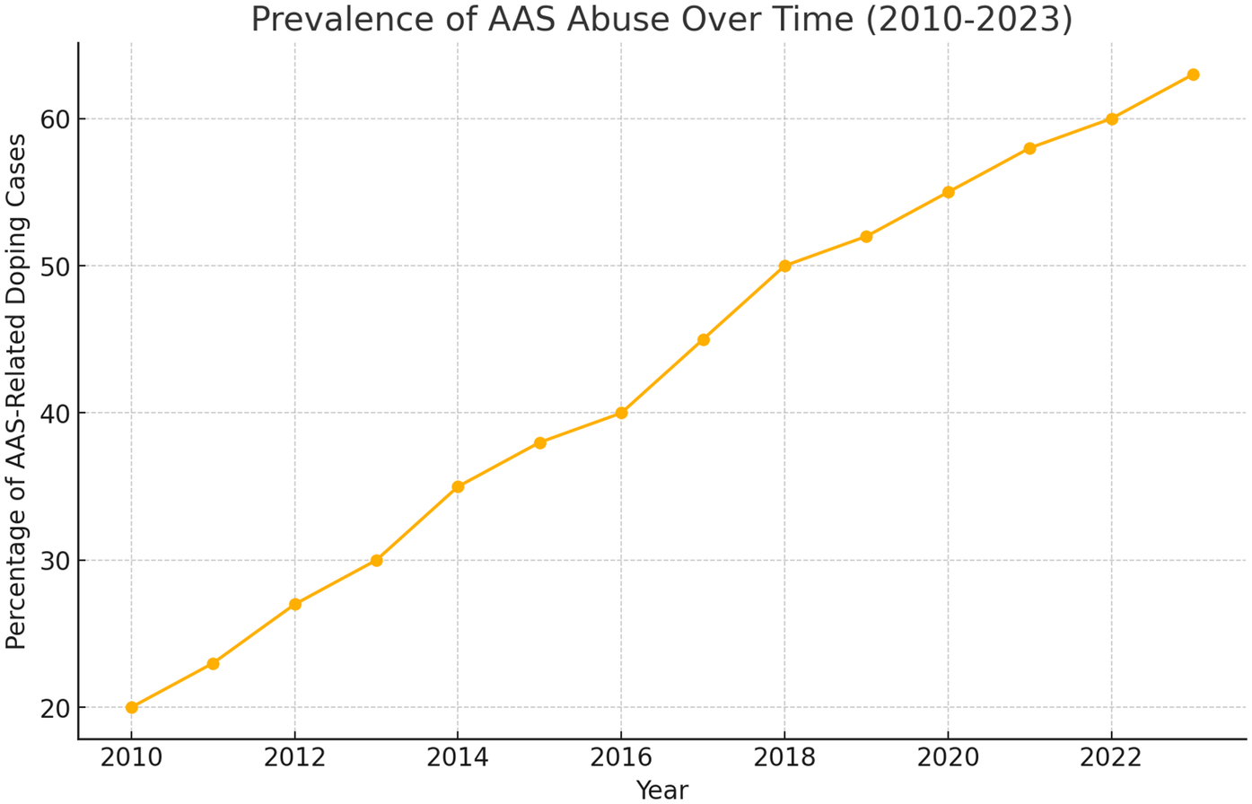 Despite their therapeutic applications, AASs account for 50% of doping cases worldwide; their misuse is also increasing among non-athletes seeking aesthetic benefits (16–18) (Figure 1). Adverse cardiovascular effects include lower plasma HDL levels (16, 19) and sudden cardiac death, often linked to hypertrophic cardiomyopathy, especially in young athletes (16, 20–23). Other organ systems - reproductive, musculoskeletal, endocrine, renal, and hematological—can also be affected, and users may experience psychological disturbances such as mood instability and aggressive behaviour (14, 16). In the Italian jurisdiction, in order to combat the use of doping substances in sport activities, a law titled “Regulation of health standards in sport activities and the fight against doping” has been enacted (Law of December 14, 2000, n.376) (24).