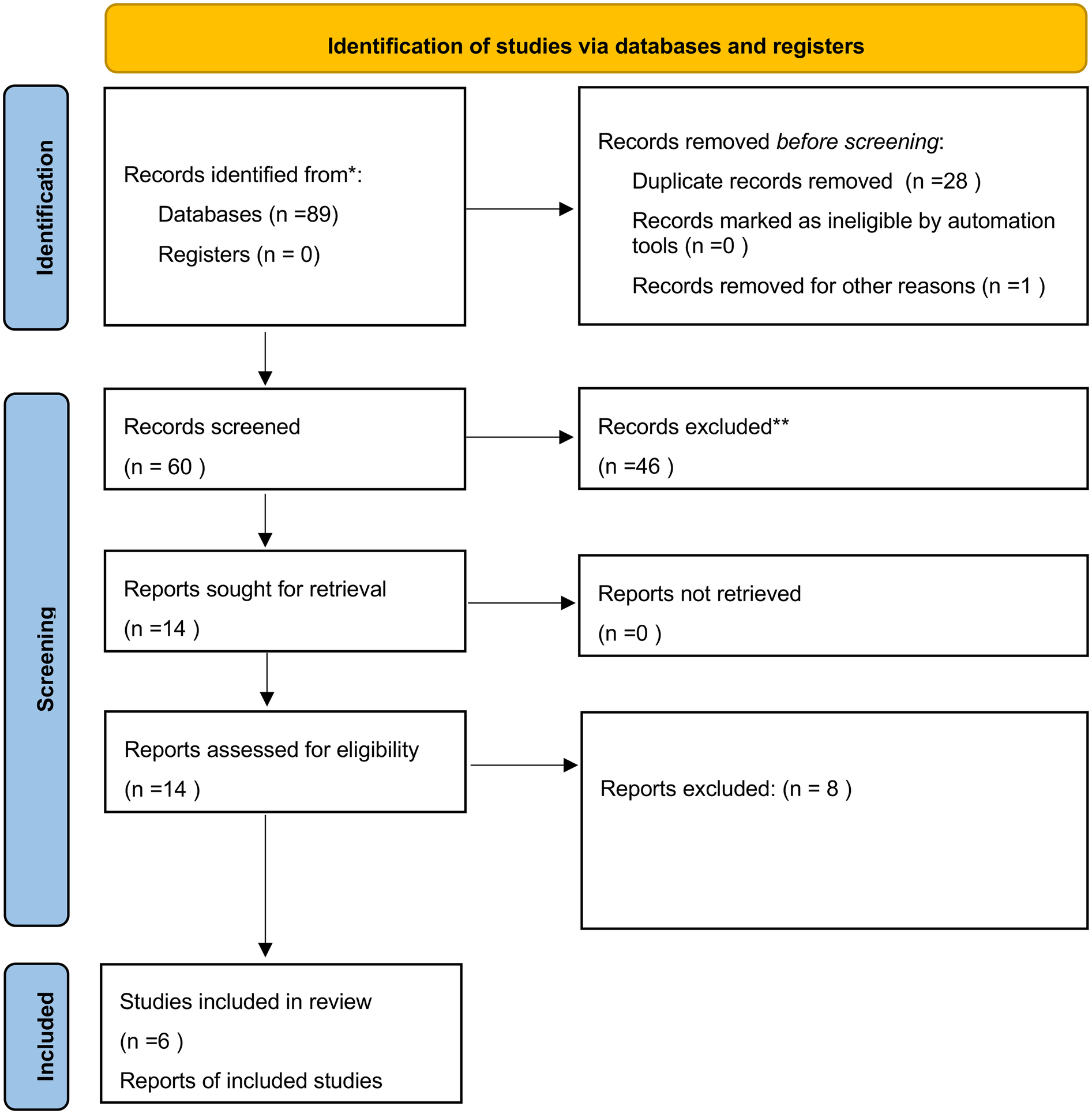 A total of 89 articles were identified; 28 were excluded as duplicates, and one was excluded because it was not accessible. The titles and abstracts of the remaining 60 articles were then reviewed; 46 were discarded as they were not relevant to the research topic (as defined by the P.I.C.O. framework). Of the 14 remaining articles, 6 were included in the review, while 8 were excluded based on the exclusion criteria outlined in the previous section. Additionally, 2 articles from other sources were added to the 6 selected articles (Figure 2).
