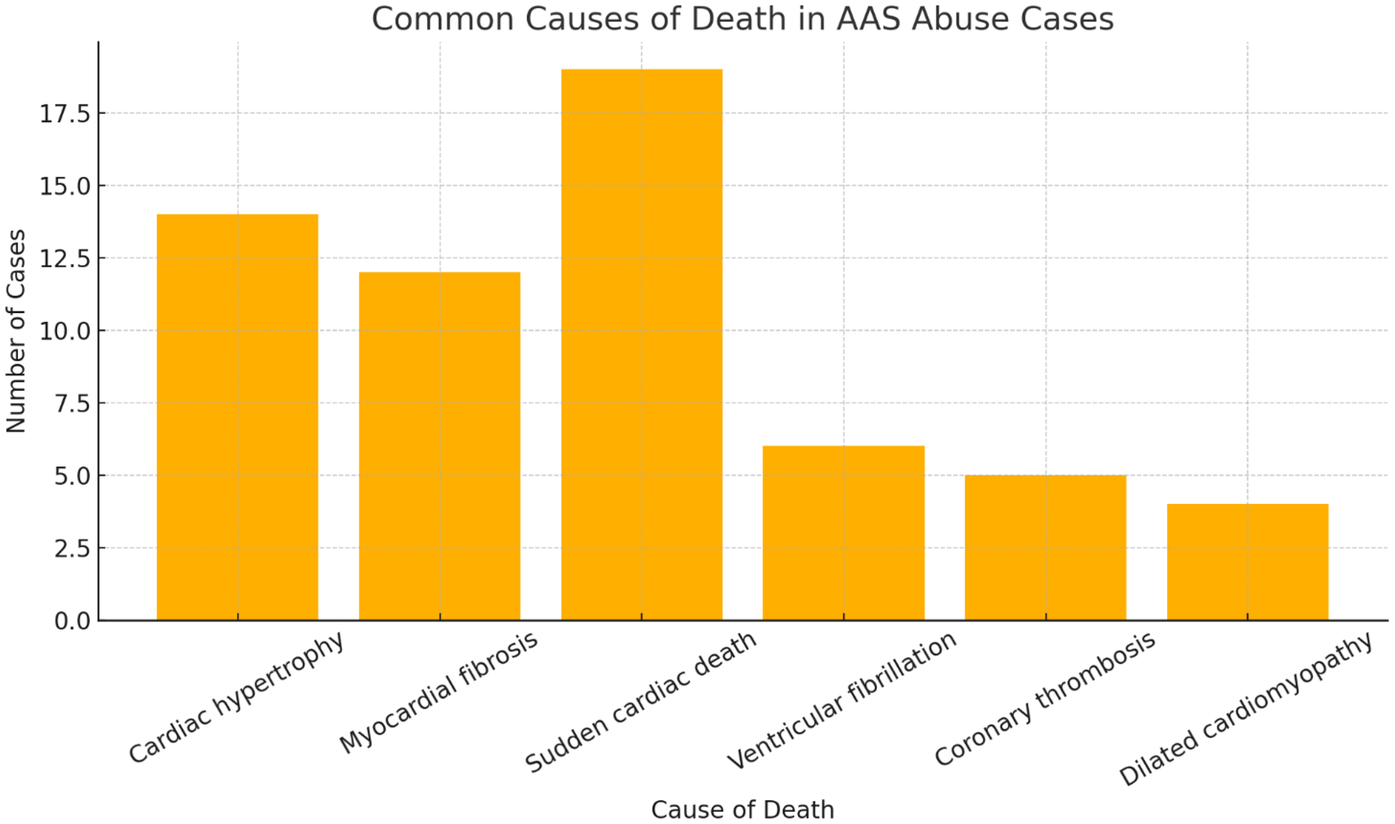 In another study by Lusetti et al. (36), five cases of sudden death involving male AAS users were analyzed, focusing on cardiac changes and systemic effects related to AAS abuse. The subjects, aged between 29 and 39 years (average age 33), used AASs for performance or aesthetic purposes. All exhibited significant muscular development, indicative of prolonged AAS use. Autopsy examinations consistently revealed cardiac hypertrophy, with left ventricular hypertrophy present in three cases and biventricular hypertrophy in one case. Heart weights ranged from 380 g to 480 g, exceeding normal values for individuals with comparable body mass. The coronary arteries showed thickening of the intimal and medial layers, with fatty streaks observed in one case. Testicular atrophy was a recurring finding in all subjects, supporting the link to steroid use. Histopathological analyses identified interstitial fibrosis and cardiomyocyte necrosis in multiple cases, with fibrotic changes predominantly affecting the left ventricle. Notably, there was no sign of acute myocardial infarction, suggesting that cardiac remodeling was a chronic process likely driven by prolonged AAS exposure. Toxicological analyses confirmed the presence of nandrolone, testosterone, boldenone, metenolone, oxandrolone, stanozolol, and clomiphene in biological samples. In several cases, additional substances such as methadone, THC, cocaine, morphine, citalopram, clozapine, venlafaxine, phenobarbital, lorazepam, and ethanol were detected, highlighting the prevalence of polypharmaceutical abuse in this population. The cause of death in all cases was attributed to cardiac arrhythmias and myocardial fibrosis, driven by AAS-induced cardiac remodeling. The presence of psychoactive substances likely exacerbated the risk of fatal arrhythmias, contributing to the sudden and unexpected nature of these deaths (36).