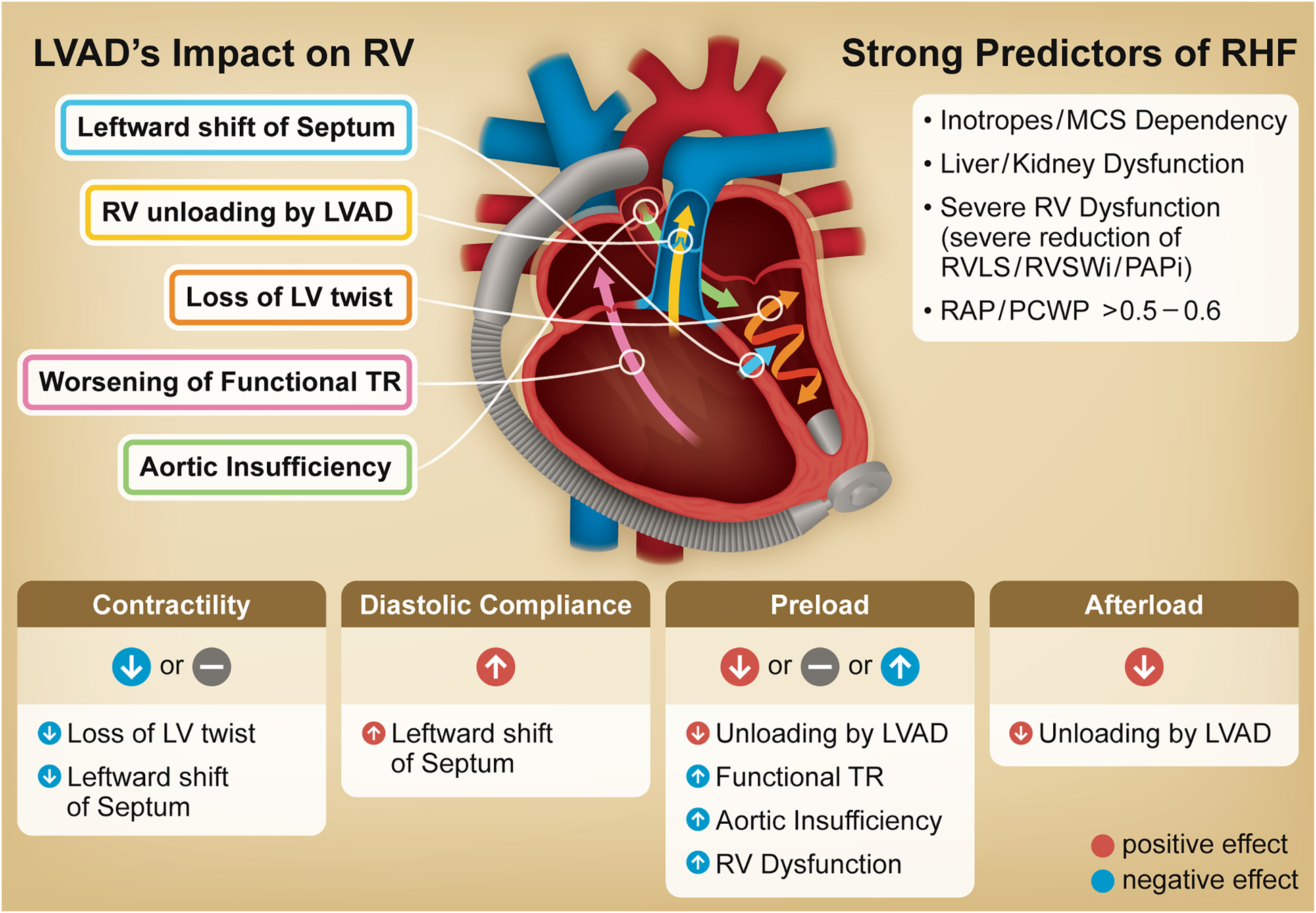 Graphical abstract. Illustration outlines the primary impact of an LVAD on the RV, including underlying mechanisms driving post-LVAD RHF. The table at the bottom summarizes changes in RV function and loading conditions following LVAD implantation. The column on the right identifies strong predictors for RHF including non-cardiac factors, all of which are incorporated into at least two representative risk scores and have been identified as significant predictors in large scale multivariable analyses. LVAD, left ventricular assist device; TR, tricuspid regurgitation; RV, right ventricle; RHF, right heart failure; MCS, mechanical circulatory support; RV LS, right ventricular longitudinal strain; RVSWi, right ventricular stroke work index; PAPi, pulmonary artery pulsatility index; RAP, right atrial pressure; PCWP, pulmonary capillary wedge pressure.