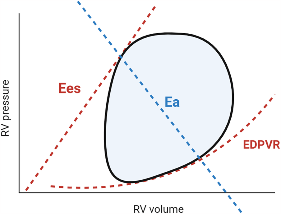 Pressure-Volume loop and right ventricular and pulmonary artery coupling. The steady-state RV PV loop (black line) illustrates the relationship between pressure and volume during a cardiac cycle. The enclosed area by the PV loop represents RV stroke work. By reducing preload (e.g., via inferior vena cava occlusion or the Valsalva maneuver), multiple PV loops can be generated, from which Ees and EDPVR can be derived. Effective pulmonary arterial elastance (Ea; blue) is a determinant of RV afterload. The RV Ees/Ea ratio describes RV-PA coupling, assessing contractility relative to load. An optimal ratio (1.5–2.0) ensures cardiac efficiency, whereas uncoupling (0.6–1.0) signifies RV decompensation (17, 20). RV, right ventricle; PV, pressure volume; Ees, end-systolic elastance; EDPVR, end-diastolic pressure volume relationship; Ea, effective arterial elastance.
