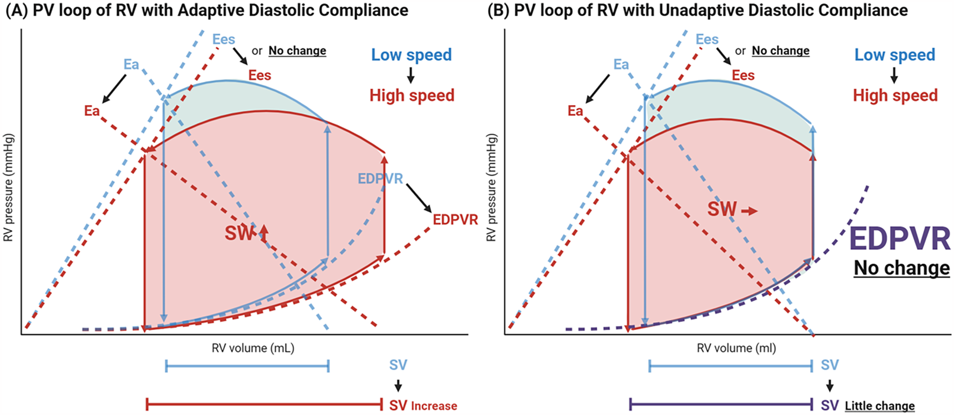 Notably, contractility did not significantly change, which contradicts the commonly held view that RV contractility declines due to loss of LV twist and impaired septum motion. In their study population, as pump speed was increased from 5,000 to 5,800 rpm, the RV PV loop expanded rightward and shifted downward, indicating an increase in SV and SW in response to higher pump speed. This change is attributed to “an improvement in diastolic compliance (EDPVR), also referred to as adaptive diastolic compliance in response to LVAD suctioning,” as well as “a reduction in afterload” (