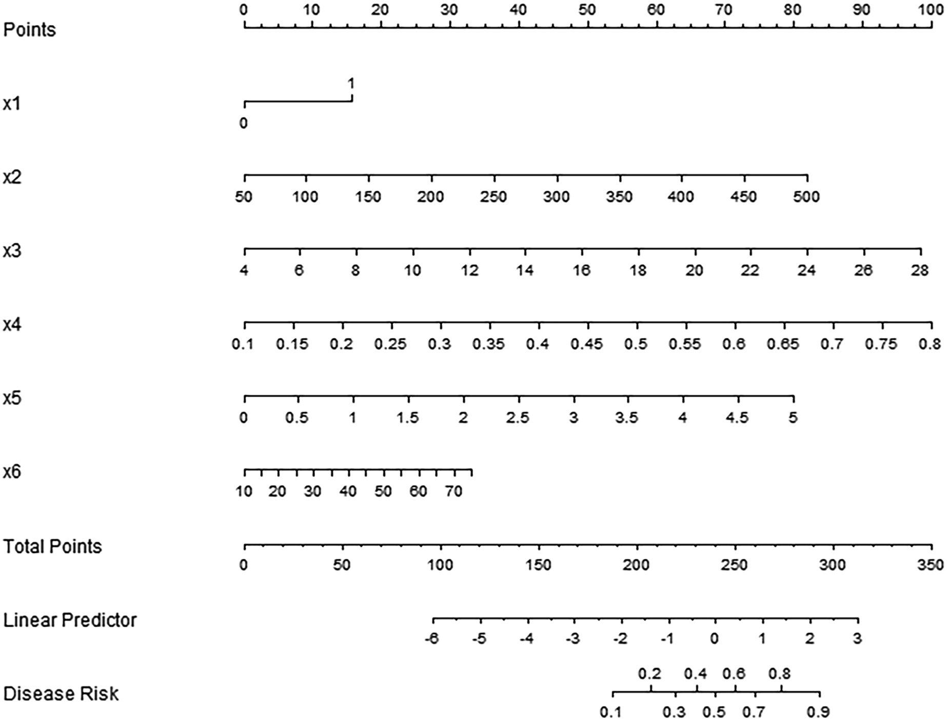 Nomogram prediction model for early recurrence after catheter ablation in patients with persistent atrial fibrillation. x1, history of diabetes; x2, BNP; x3, homocysteine; x4, MHR; x5, NLR; x6, Ang Ⅱ.
