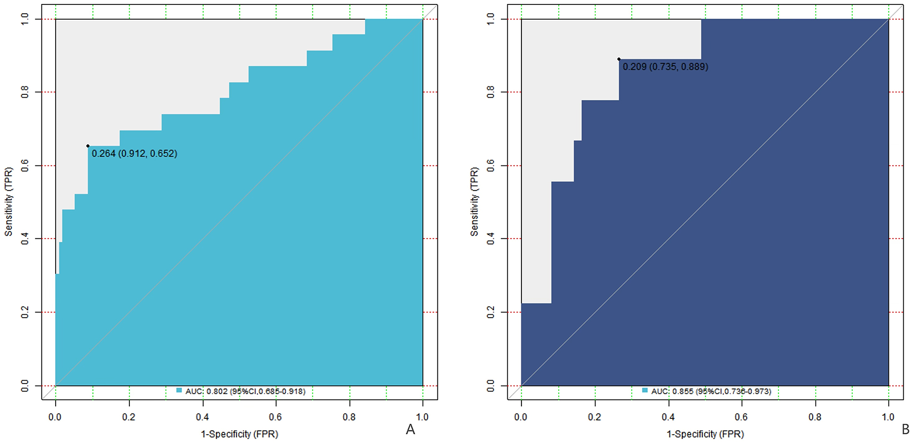 C-index index (consistency index) is an important index to measure the distinguishing ability of forecasting models, and its value ranges from 0.5 (no forecasting ability) to 1 (perfect forecasting). In the training set, the C-index index of the nomogram prediction model was 0.803, the average absolute error of the predicted value in accordance with the actual value shown in the calibration curve was 0.095, and the P = 0.244 test by Hosmer-Lemeshow indicated that the model fitted well. The ROC curve showed that the model had an AUC of 0.802 (95% CI: 0.685–0.918) for predicting early postoperative recurrence, a sensitivity of 0.652, and a specificity of 0.912. In the validation set, the C-index was 0.846, the mean absolute error was 0.099, the Hosmer-Lemeshow test P = 0.523, the AUC was 0.855 (95% CI: 0.736–0.973), the sensitivity was 0.778, and the specificity was 0.816. The C index of this model in the training set and the validation set is 0.803 and 0.846 respectively, which indicates that when doctors use this model to predict recurrence, there is a 80.3%–84.6% probability that they can correctly distinguish between recurrent and non-recurrent patients (better than 50% of random guess). The area under ROC curve further proves that its discrimination ability is close to excellent level (AUC > 0.8). The calibration curve and ROC curve are shown in Figures 2, 3, respectively.