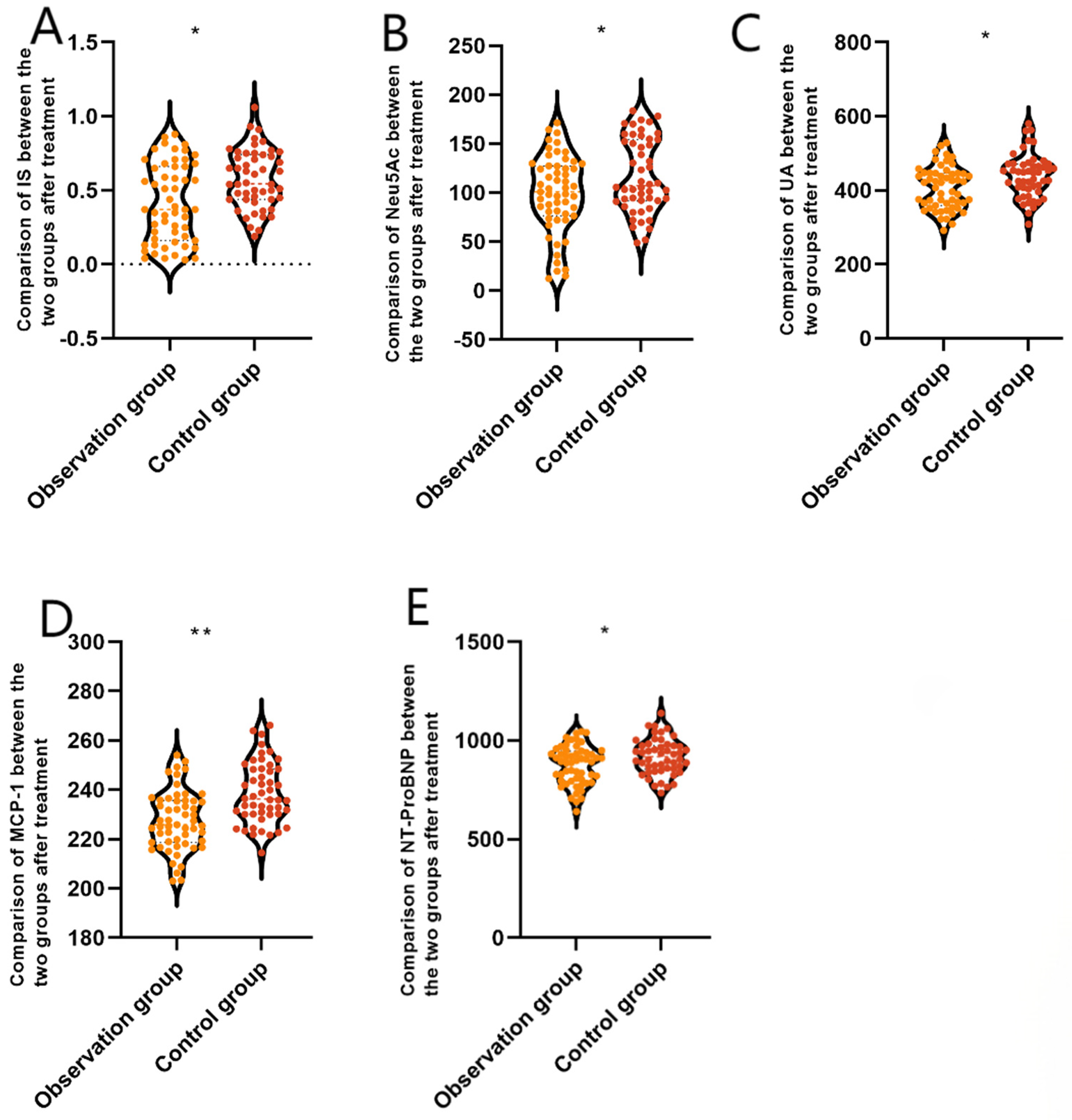 Comparison of serum biomarkers between the two groups after treatment. (A) NT-ProBNP, (B) MCP-1, (C) UA, (D) Neu5Ac, and (E) IS. Data are presented as mean ± standard deviation. *P < 0.05, **P < 0.001 vs. the control group. NT-ProBNP, amino-terminal B-type brain natriuretic peptide precursor; MCP-1, monocyte chemotactic protein 1; UA, uric acid; Neu5Ac, N-acetylneuraminic acid; IS, indole sulphate phenol.