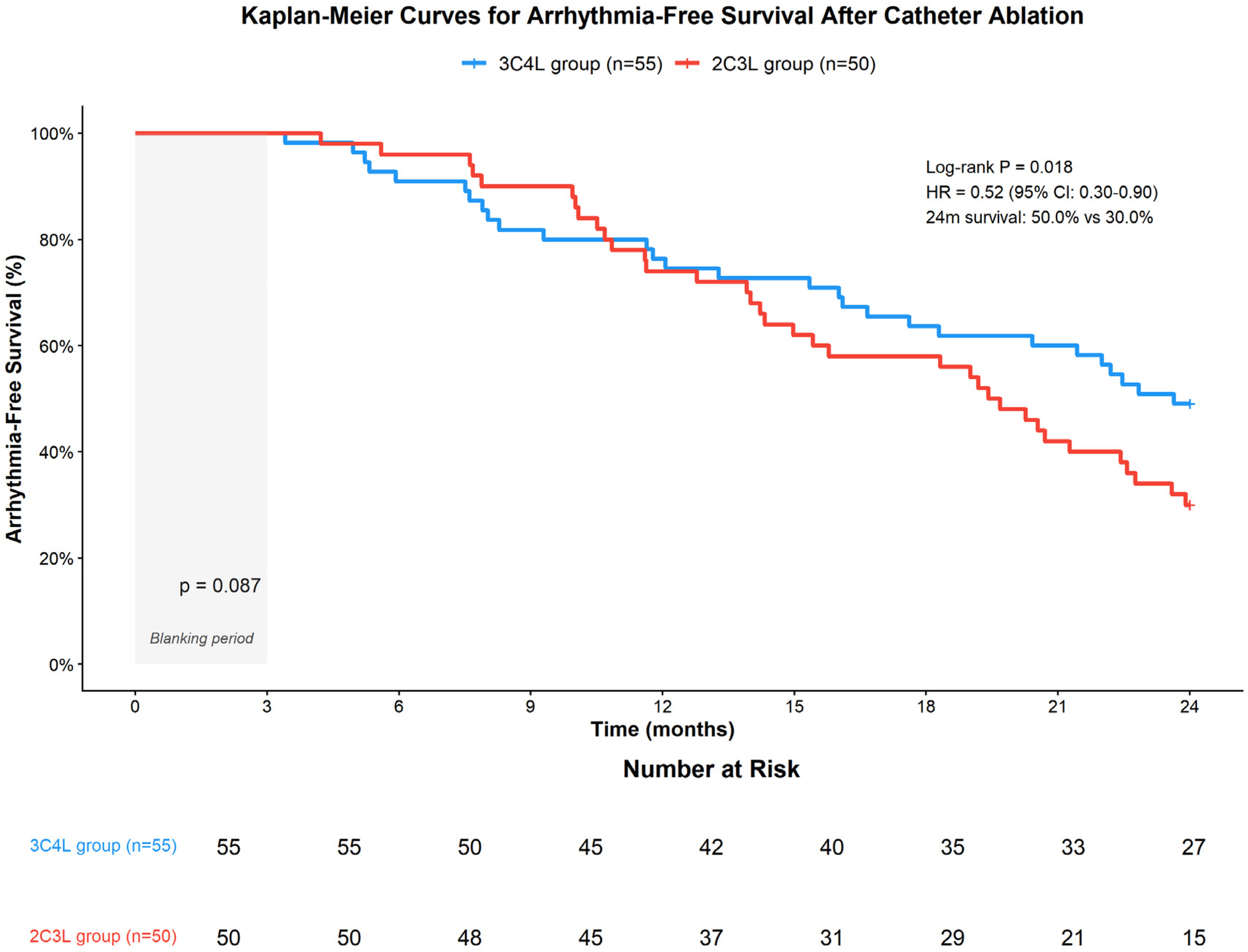 There was no statistically significant difference in circumferential pulmonary vein isolation ablation time, cavotricuspid isthmus ablation time, and left atrial apical line ablation time between the 3C4L group and the 2C3L group (P > 0.05). However, the 3C4L group had significantly longer total procedure time (172.06 ± 39.33 vs. 156.10 ± 36.37 min, P = 0.034), mitral isthmus ablation time (14.58 ± 2.78 vs. 10.21 ± 2.96 min, P < 0.001), X-ray exposure time (7.05 ± 1.87 vs. 2.60 ± 0.42 min, P < 0.001), and greater saline perfusion volume (1,197.43 ± 184.47 vs. 1,072.33 ± 57.42 mL, P < 0.001) compared to the 2C3L group. Before treatment, there were no significant differences between groups in quantitative myocardial motion parameters and serum biomarker indexes (P > 0.05). After treatment, the 3C4L group showed significantly better improvement in quantitative myocardial motion parameters and serum biomarker indexes compared to the 2C3L group (all P < 0.05). The total incidence rate of complications was not significantly different between the 3C4L group (20.00%, 11/55) and the 2C3L group (16.00%, 8/50) (χ2 = 0.575, P = 0.448). At 24 months, Kaplan–Meier analysis demonstrated significantly higher arrhythmia-free survival in the 3C4L group compared to the 2C3L group (50.0% vs. 30.0%, log-rank P = 0.018; hazard ratio 0.52, 95% confidence interval: 0.30–0.90).