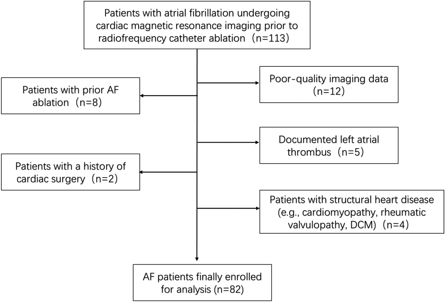 With ethical approval from Xuzhou Central Hospital, this retrospective study analyzed patient data extracted from the hospital database on July 1, 2023, aiming to explore the association between left atrial wall thickness and fibrosis in atrial fibrillation patients. This study retrospectively enrolled 113 consecutive patients who underwent voltage mapping and LGE-MRI prior to radiofrequency ablation at Xuzhou Central Hospital (Xuzhou, China) between March 2016 and May 2023. The duration of AF was classified as either paroxysmal AF (less than 7 days) or persistent AF (more than 7 days). Persistent atrial fibrillation is defined as atrial fibrillation lasting from 7 days to 12 months, whereas long-standing persistent atrial fibrillation refers to guidelines where the duration exceeds 12 months. We excluded patients with previous catheter ablation, poor LGE-MRI image quality, documented left atrial thrombus, previous cardiac surgery, and structural heart disease. After applying the exclusion criteria, 82 patients with atrial fibrillation were ultimately included in the final analysis (Figure 1 Flowchart). Clinical characteristics were obtained from the medical record system. This study was conducted in accordance with the Declaration of Helsinki and received approval from the Research Ethics Committee of Xuzhou Central Hospital (Approval No. XZXY-LK-20230626-092) and the local National Health Service Research Ethics Committee (Study ID: MR-32-23-020405; www.medicalresearch.org.cn). Written informed consent was obtained from the patient before performing catheter ablation.