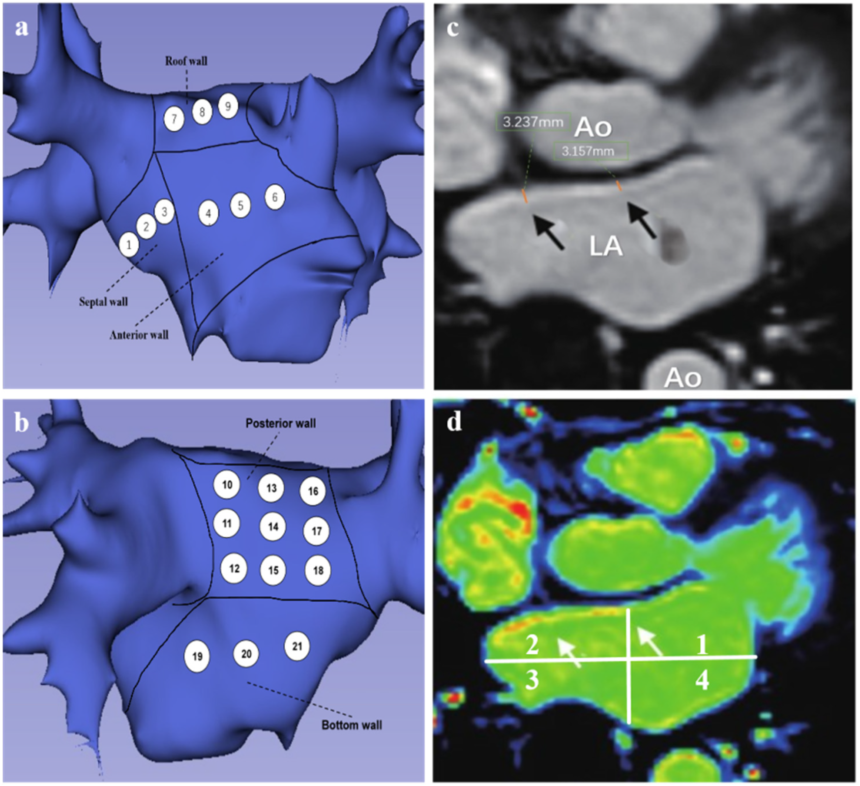 (a,b) Patterns of left atrial segment measurements. (a) Left atrial anteroposterior position, 1–3 represents the region of interstitial wall thickness measurement, 4–6 represents the region of AWT measurement, and 7–9 represents the region of RWT measurement. (b) Posterior-anterior position, 10–18 represents the PWT measurement region, 19–21 represents the BWT measurement region. (c,d) Representative LGE-MRI images of the left atrium. (c) Black arrows are examples of LAWT measurements. (d) magnetic resonance image of delayed enhancement zones (axial position), white arrows point to red and yellow zones representing fibrotic zones.