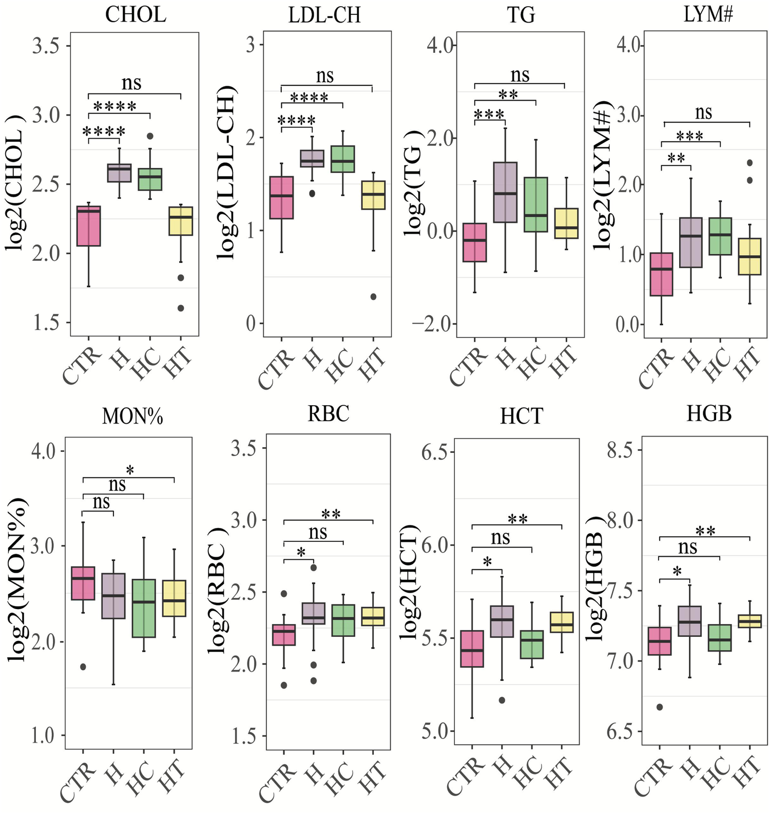 Box plots of significantly different physiological and biochemical parameters. CHOL, cholesterol concentration (mmol/L); LDL-CH, low-density lipoprotein cholesterol concentration (mmol/L); TG, triglyceride concentration (mmol/L); LYM#, represents the number of lymphocytes (10e9/L); MON%, the percentage of monocytes (%); RBC, red blood cell count (10e12/L); HCT, hematocrit (%); HGB, hemoglobin concentration (g/L). *P < 0.05, **P < 0.01, ***P < 0.001, ****P < 0.0001 by the Wilcoxon rank-sum test. CTR: control group; H: concomitant hypertension and hyperlipidemia; HC; hyperlipidemia; HT: hypertension.