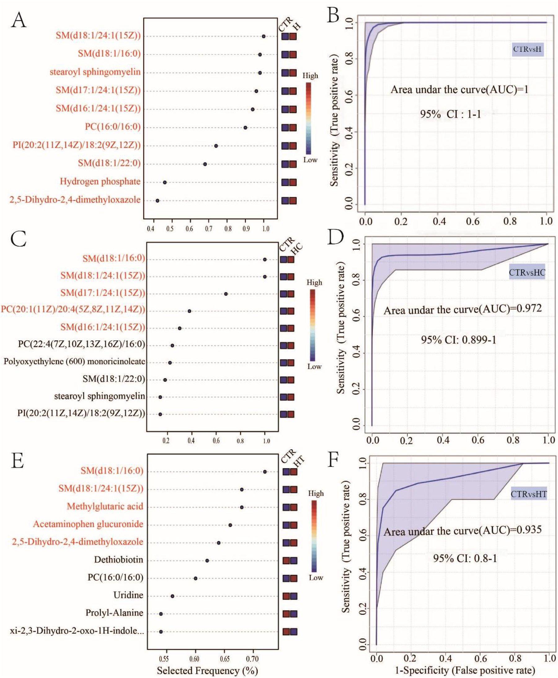 Biomarker analysis of hypertension, hyperlipidemia, and both conditions. Metabolite selection frequency for optimal area under the curve (AUC) between CTR and H (A), CTR and HC (C), and CTR and HT (E) Multivariate ROC curves between CTR and H (B), CTR and HC (D), and CTR and HT (F).