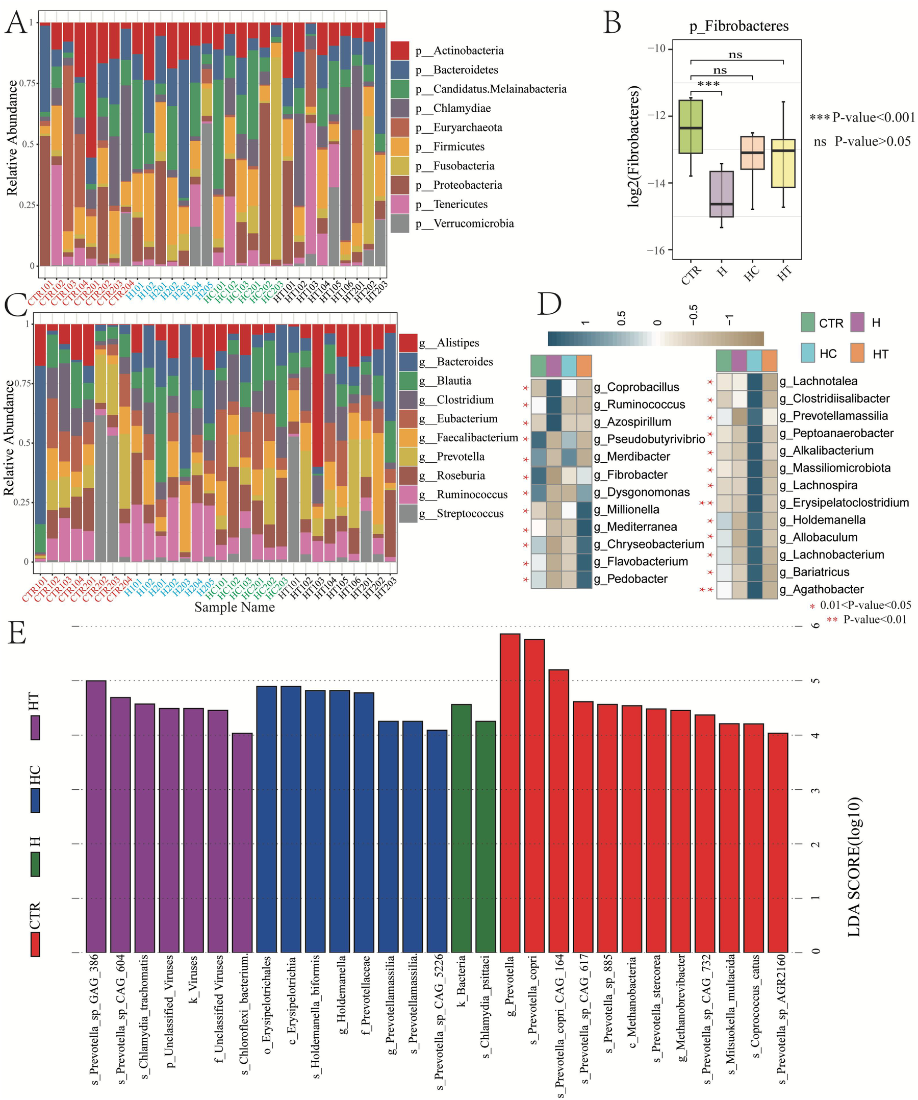 Gut microbiome variances among groups. (A) Bar chart showing relative abundances of top 10 microbial phyla. (B) Box plot showing the relative abundance variances of Fibrobacteres among groups. (C) Bar chart showing relative abundances of top 10 microbial genera. (D) Heatmap showing the relative abundance of differential microbial genera across groups. E: Distribution of linear discriminant analysis (LDA) scores for differential microbial taxa (LDA score >4).