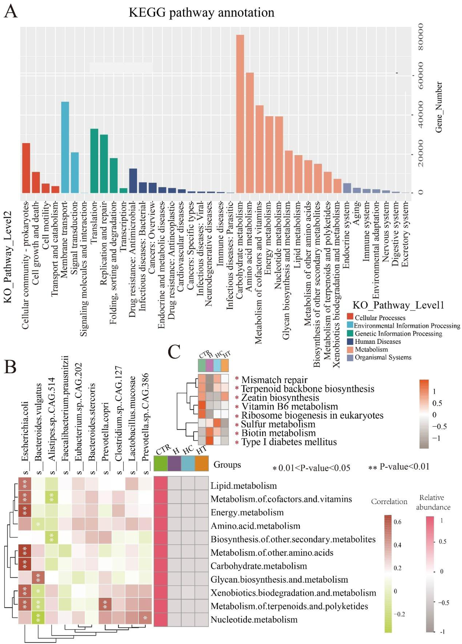 Functional annotation and pathway analysis were performed on the metagenomes to investigate differences in metabolic functions among the microbial communities. KEGG-based annotation revealed gene assignments across six primary level 1 categories, namely: cellular processes, environmental information processing, genetic information processing, human diseases, metabolism, and organismal systems. At the secondary level, these categories encompassed 4, 3, 4, 11, 11, and 7 pathways, respectively. Notably, the metabolism category exhibited the greatest number of annotated secondary pathways and genes (Figure 5A). Subsequent correlation analysis between secondary metabolism pathways and microbial species revealed several significant associations. For instance, E. coli exhibited strong correlations with lipid metabolism and six additional pathways. Bacteroides vulgatus was related to glycan biosynthesis and metabolism, along with four other pathways. Alistipes sp. CAG.514 showed correlations with metabolism of cofactors and vitamins, as well as biosynthesis of other secondary metabolites. Prevotella copri was significantly correlated with metabolism of terpenoids and polyketides, while Prevotella sp. CAG.386 with nucleotide metabolism. Notably, these pathways exhibited lower relative abundance in the three disease groups than in the control group (Figure 5B), suggesting that their correlated microorganisms might influence the metabolic pathway functions associated with these diseases. At level 3, eight pathways exhibited significant differences among groups. In the H group, mismatch repair, terpenoid backbone biosynthesis, zeatin biosynthesis, vitamin B6 metabolism, and ribosome biogenesis in eukaryotes were suppressed, while sulfur metabolism, biotin metabolism, and Type I diabetes mellitus pathways were activated. The HC group showed similar suppression of zeatin biosynthesis, vitamin B6 metabolism, and ribosome biogenesis in eukaryotes, alongside activation of sulfur and biotin metabolism pathways. In the HT group, mismatch repair, vitamin B6 metabolism, and ribosome biogenesis in eukaryotes pathways were suppressed (Figure 5C).