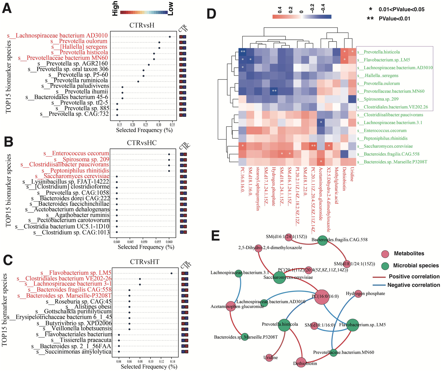 Detection of gut microbiome biomarkers. (A–C) Microbial selection frequency for optimal area under the curve (AUC) between CTR and H (A), CTR and HC (B), and CTR and HT (C,D) Heatmap of correlation analysis between key differential microbial species and differential metabolites. The color blocks denote the strength of correlation, with red indicating a positive correlation and blue signifying a negative correlation. (E) Correlation network analysis between key differential microbial species and differential metabolites. Nodes represent microbial species (green) and metabolites (red), while edges indicate significant correlations (P < 0.05). Red edges denote positive correlations, and blue edges represent negative correlations. The size of each node corresponds to the strength (degree) of its associations, with larger nodes indicating higher connectivity.