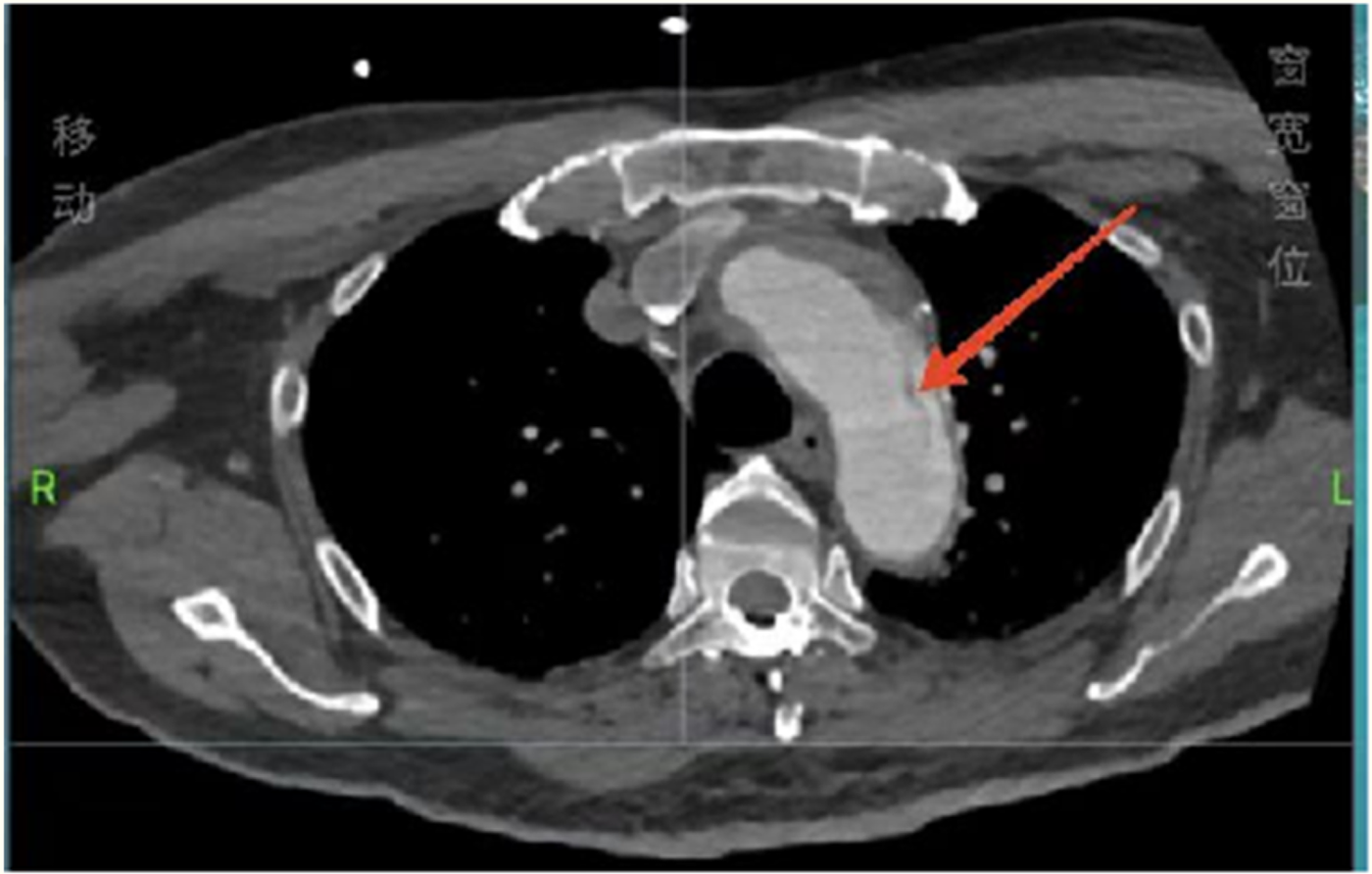 Considering the patient’s impaired consciousness and uncooperative state, endotracheal intubation and mechanical ventilation were initiated. The initial presentation of cyanosis and cold extremities suggested circulatory shock. Bedside echocardiography, along with laboratory tests, (Table 1) indicated dilation of the ascending aorta and a substantial hypoechoic pericardial effusion (Figure 1), findings highly suggestive of aortic dissection. Once stabilized on a portable ventilator, the patient underwent emergent non-contrast cranial computed tomography (CT) and whole-aortic computed tomography angiography (CTA). Imaging demonstrated hypodense shadows along the aortic arch and anterior abdominal aortic wall, confirming an aortic arch dissection with localized rupture (Figure 2). This resulted in an intramural hematoma extending into the ascending aorta, the aortic arch, and the origin of the left common carotid artery, accompanied by massive pericardial hemorrhage (Figure 3). Cranial CT revealed no abnormalities.