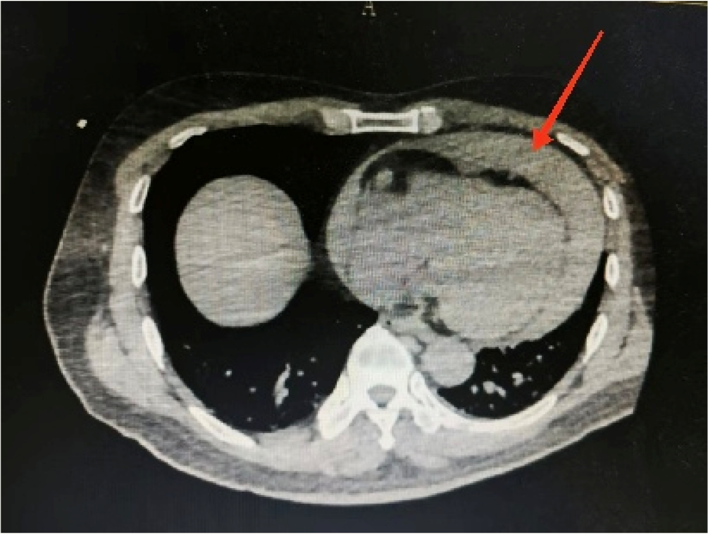 Aortic computed tomography angiography showing a massive hemorrhage of the pericardium.