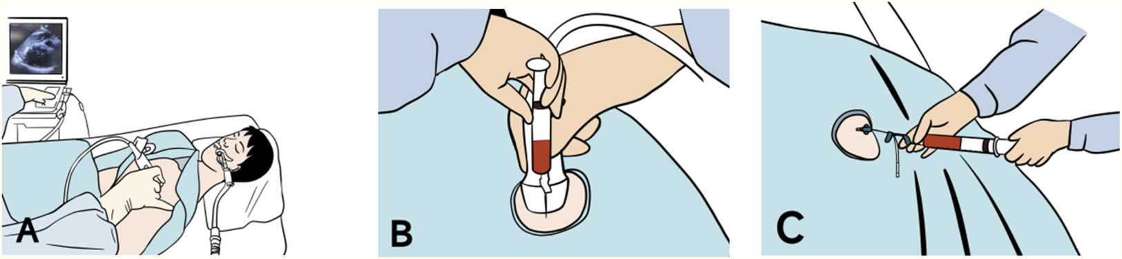 (A) Emergency bedside ultrasound showing localization of pericardial effusion. (B) First aspiration yields approximately 4 mL of pericardial effusion after needle puncture. (C) Second aspiration yields approximately 6 mL of pericardial effusion after successful placement of the drainage catheter.