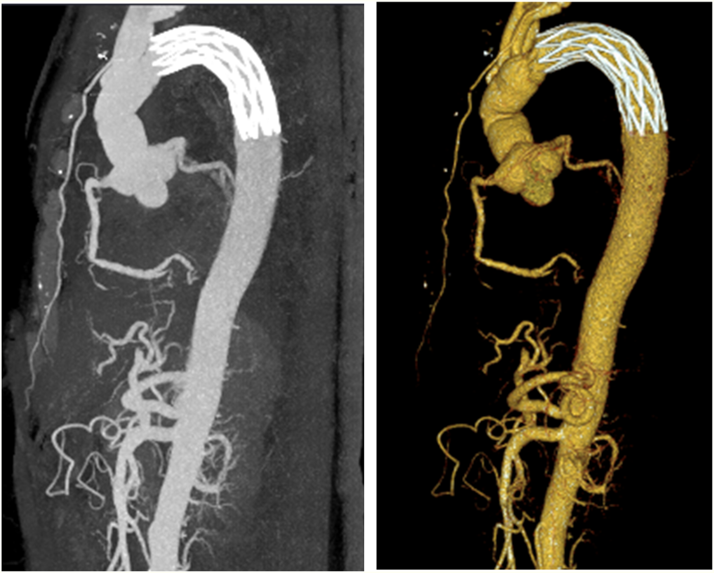 Computed tomography conducted after aortic arch artificial vessel replacement.