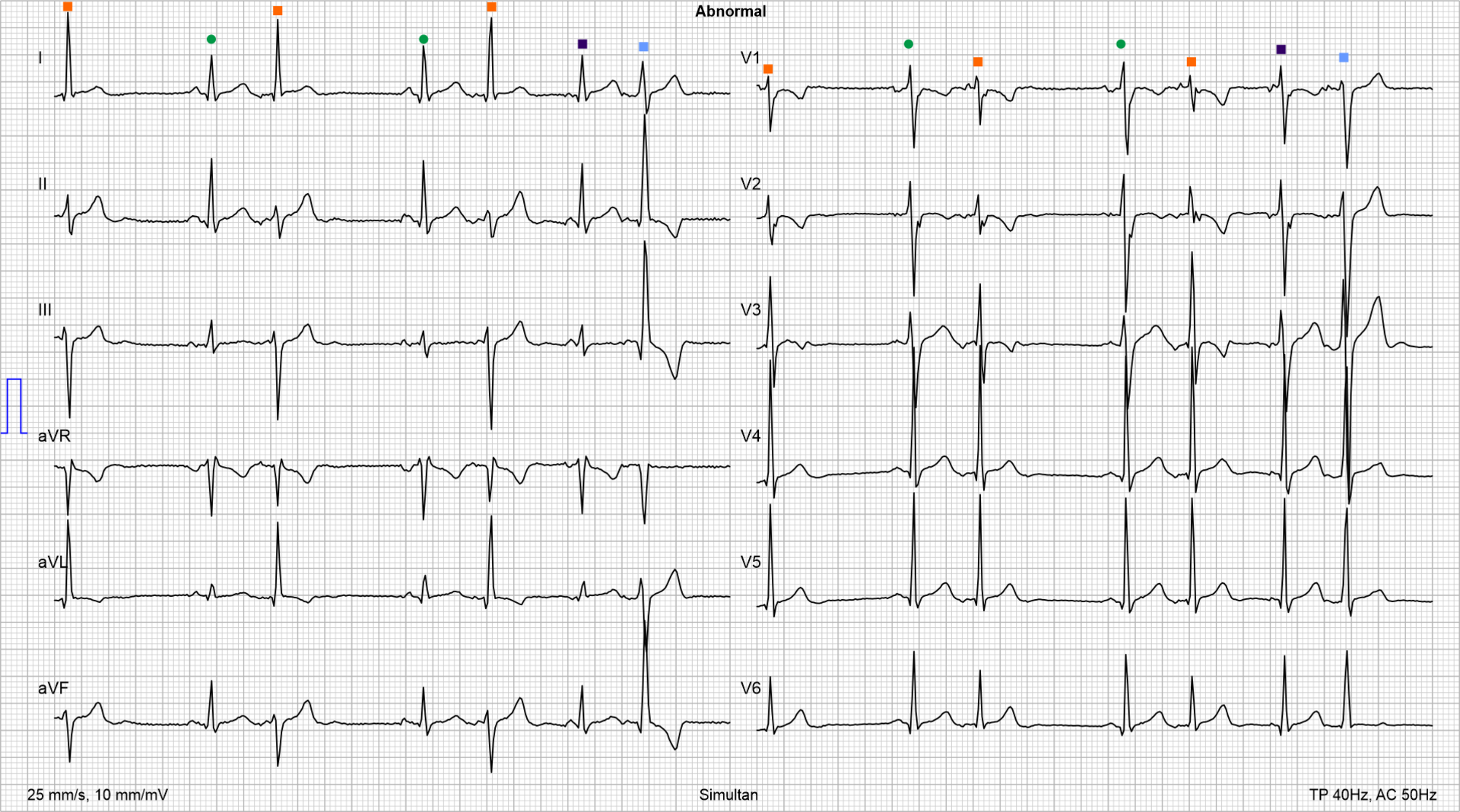 Initial ECG. Irregular heart rhythm with some sinus beats (green dots) along with numerous premature beats with different QRS complex morphologies typically preceded by a low-amplitude P wave, indicating aberrant conduction: narrow QRS complexes with a QRS vector similar to a sinus rhythm (dark purple squares) (QRS vector: ∼50°), narrow QRS complexes with a QRS vector of −20° (orange squares), and wide QRS complexes with a QRS vector of ∼−40° (blue squares).