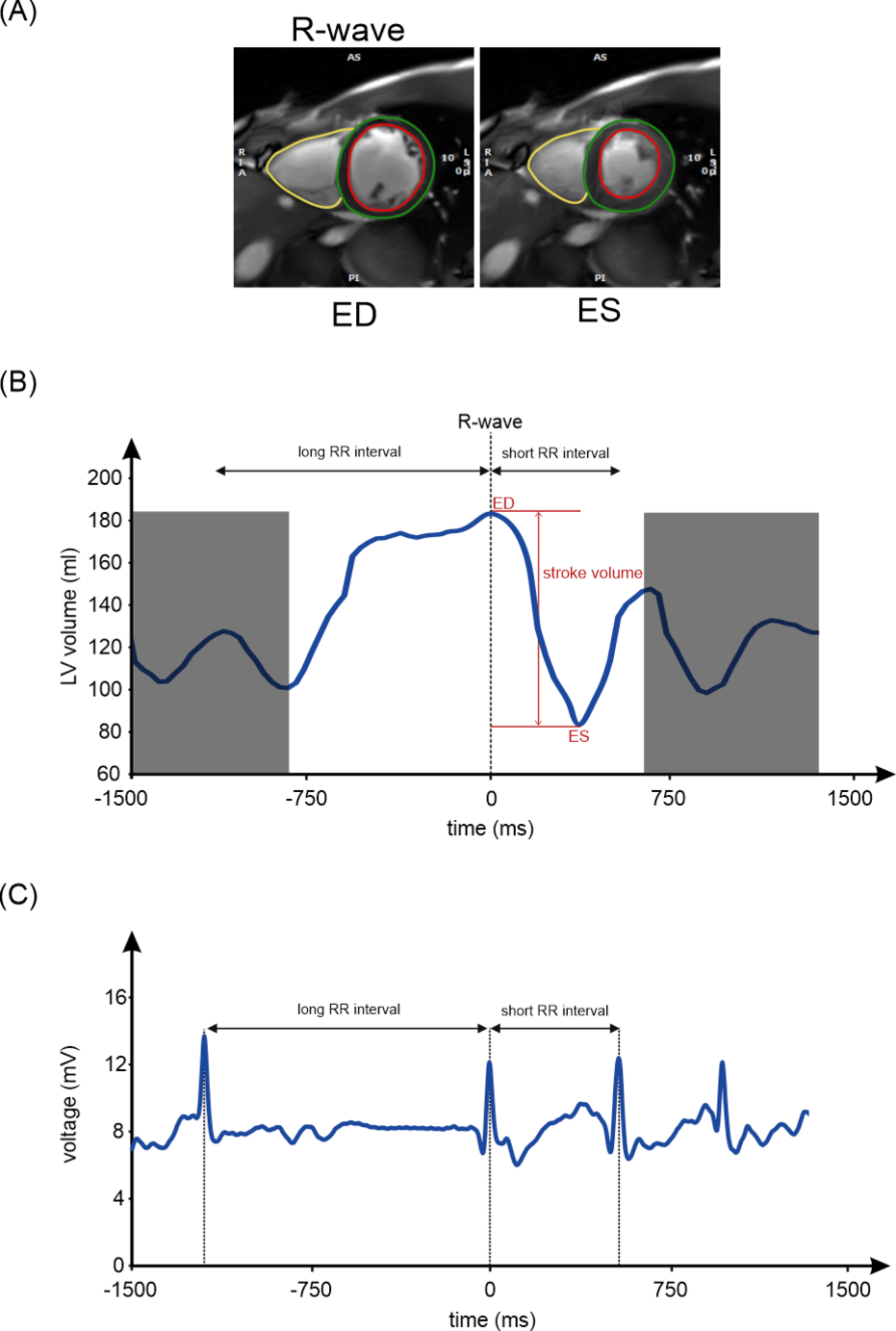 Left ventricular volumetry. (A) Images at end-diastole and the corresponding end-systole of a midventricular slice of the short-axis stack. (B) The corresponding left ventricular volume curve of the short-axis stack, with the end-diastolic phase and the corresponding end-systolic phase of all slices determining the LV stroke volume. The contractions adjacent to the sinus beat are not exactly aligned in all the slices of the short-axis stack, and therefore, the volume values cannot be evaluated and are grayed out. (C) The corresponding ECG of the midventricular slice shows the time of the R-wave and the corresponding long RR interval before it and the short RR interval after it, which allows for classification of the beat as a sinus beat. LV, left ventricular; ED, end-diastole; ES, end-systole.