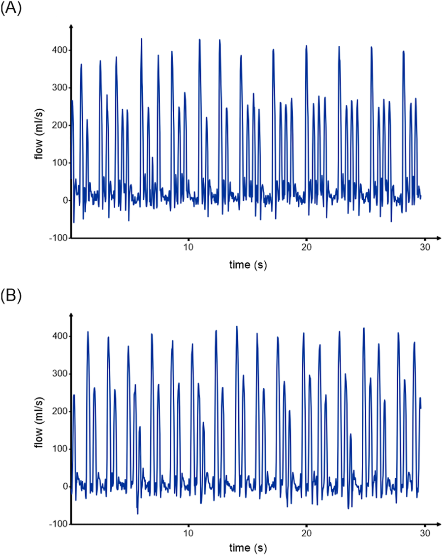 Real-time flow. (A) Aortic flow and (B) pulmonary flow over a duration of 30 s show that the amplitude after a long RR interval (sinus beat) is high, whereas the amplitude after a short RR interval (premature contraction) is low. While the amplitude of different premature beats in the aorta is similarly reduced, the amplitude of a premature contraction following a previous premature contraction in the pulmonary trunk is even lower.