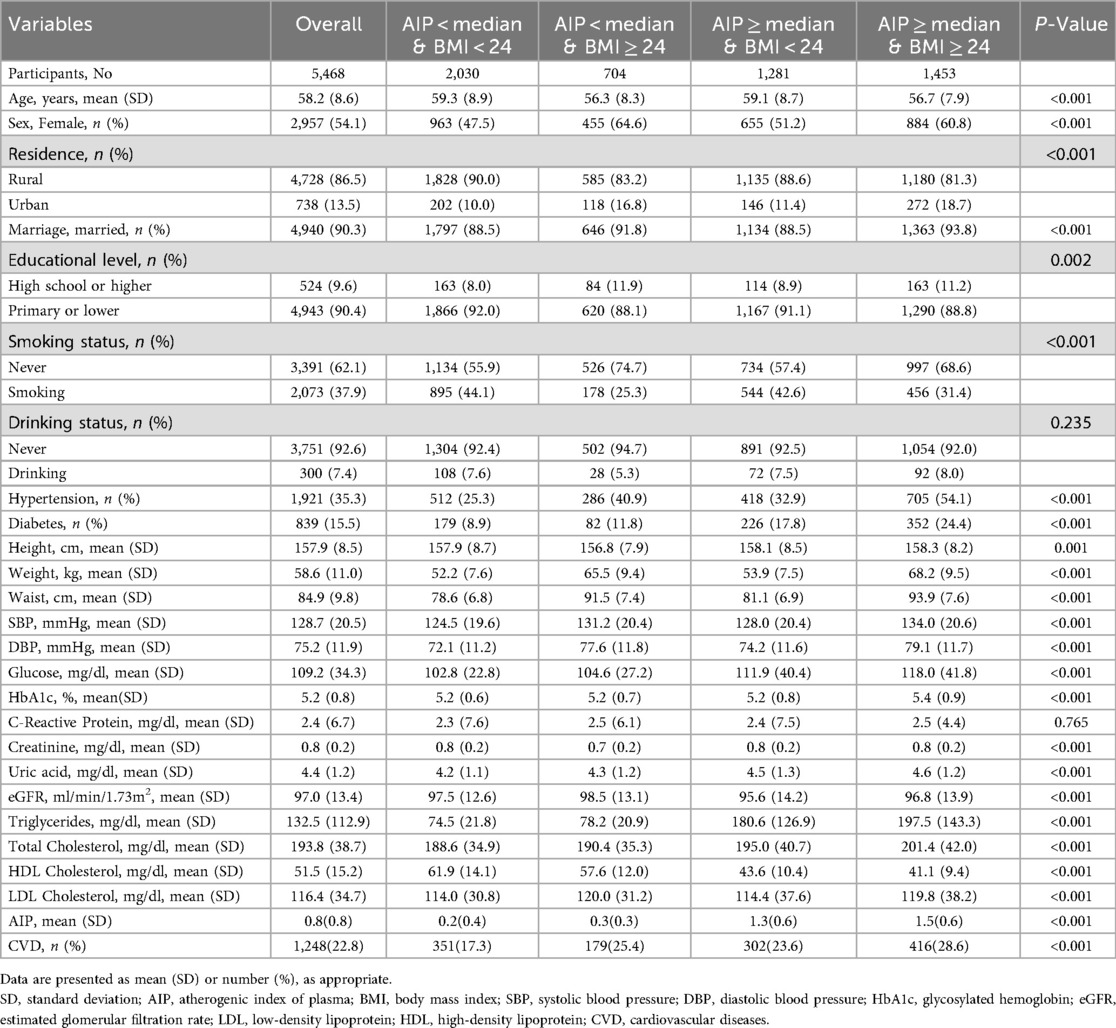 The baseline clinical and demographic data of the participants, grouped by AIP and BMI are shown in Table 1, and those of the participants grouped by cardiovascular diseases are shown in Supplementary Table S1 and Table 1 shows the final analysis comprised a total of 5,468 participants from the 2011–2020 CHARLS project. There were 2,957 (54.1%) females and a mean (SD) age of 58.2 (8.6) years. 1,248 (22.8%) people got cardiovascular diseases throughout a maximum follow-up time of 9.0 years, including 1,074 (19.6%) instances of heart disease and 447 (8.2%) cases of stroke. There were 1,921 (35.3%) patients with hypertension and 839 (15.5%) with diabetes. Supplementary Table S1 shows that among those who developed cardiovascular diseases during the follow-up period, weight, BMI, and AIP significantly increased. According to Table 1, the group with higher AIP and BMI had higher rates of diabetes and hypertension. Furthermore, whereas HDL-C levels were lower in these groups, HbA1c, waist circumference, total cholesterol (TC), systolic blood pressure (SBP), fasting plasma glucose, diastolic blood pressure (DBP), TG, and uric acid levels were higher.