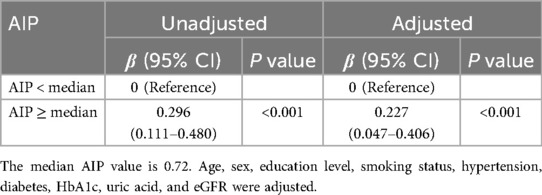 The relationship between AIP and BMI levels is seen in Table 2. The participants with greater AIP had significantly higher BMI levels after controlling for covariates (AIP ≥ median: β: 0.227, 95% CI: 0.047–0.406). Supplementary Figure S1 shows that there is a notable increase in BMI in tandem with an increase in AIP.