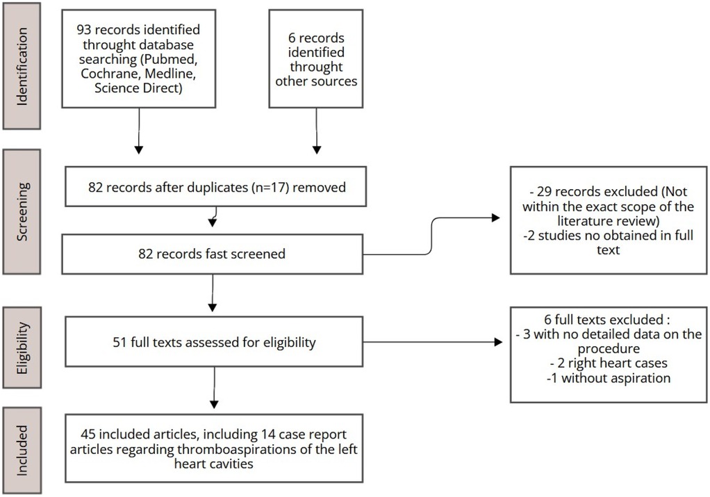 The literature review was carried out using the PubMed, Medline, ScienceDirect, and Cochrane databases. Initially, 99 articles were identified, predominantly covering the period from 2014 to 2024, with a few seminal works included as exceptions (Figure 1). After excluding irrelevant studies and duplicates, 45 articles were deemed relevant and selected for qualitative analysis. Emphasis was placed on recent case reports focusing on aspiration within the left heart chambers, ensuring an up- to-date exploration of contemporary practices.