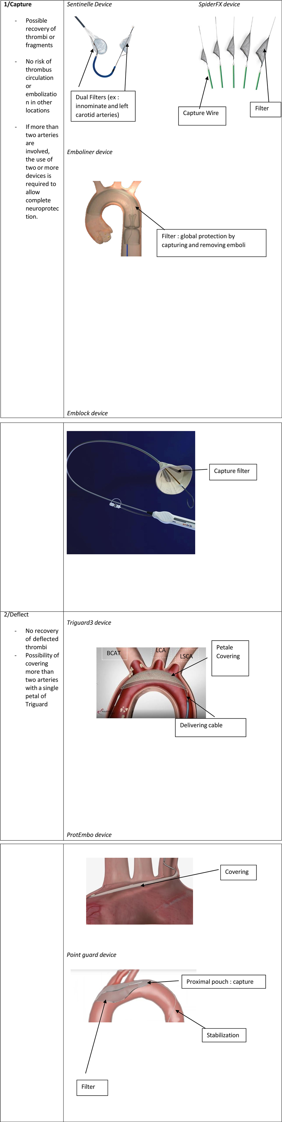 In conclusion, it appears prudent to recommend the routine use of neuroprotection devices during planned aspirations of thrombi, vegetations, or cardiac masses to prevent neurological complications. While several systems have been developed, primarily for TAVI procedures, we advocate for the approach outlined in the Lausanne Novel Procedure (4), which offers near-complete protection through the deployment of two Sentinel devices: one placed in the innominate artery and left common carotid artery, and the other positioned at the entry of the left subclavian artery to also safeguard the left vertebral artery. Although this method may be time-consuming and technically demanding depending on the patient's anatomy, it allows for unimpeded blood flow and significantly reduces the neurological risk. In addition to the three devices examined in our review, emerging systems such as Point Guard®(Transverse Medical, Golden, CO, USA), Emblock®(Innovative Cardiovascular Solutions, Grand Rapids, Michigan), and ProtEmbo® (Protembis, Aachen, Germany) merit further investigation (31). These devices vary in protective strategies—either capturing or deflecting emboli—as well as access site requirements and delivery sheath sizes. As neuroprotection technologies evolve, it is crucial to thoroughly evaluate these novel devices to ensure optimal safety and efficacy in preventing cerebral embolic events during cardiac procedures. We are particularly optimistic about next-generation full-body filters like the Emboliner® (Emboline, Inc., Santa Cruz, California) and Captis® (Filterlex Medical Ltd., Caesarea, Israel), which have shown promising results in early studies (32). These devices offer comprehensive protection for both cerebral and systemic vessels, marking a significant advancement in neuroprotection technology.
