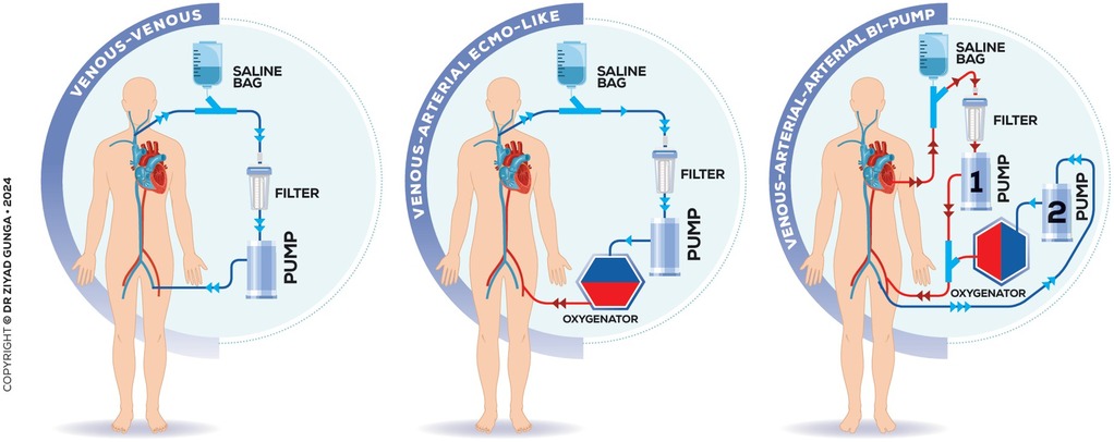 Key risks associated with ECMO include increased platelet aggregation, reduction of factor VIII and von Willebrand factor, and decreased fibrinogen levels within the first 24 h (42). In addition, ECMO is associated with a higher likelihood of bleeding, thromboembolic events—including intracardiac thrombi in arterio-venous ECMO (43)—air embolism, and mechanical complications such as circuit cavitation, limb ischemia, vessel perforation, dissection, and pseudoaneurysms (44). The risk of neurological complications, such as ischemic stroke, hypoxic-ischemic brain injury, and brain death, is also elevated (45), particularly in arterio-venous configurations.