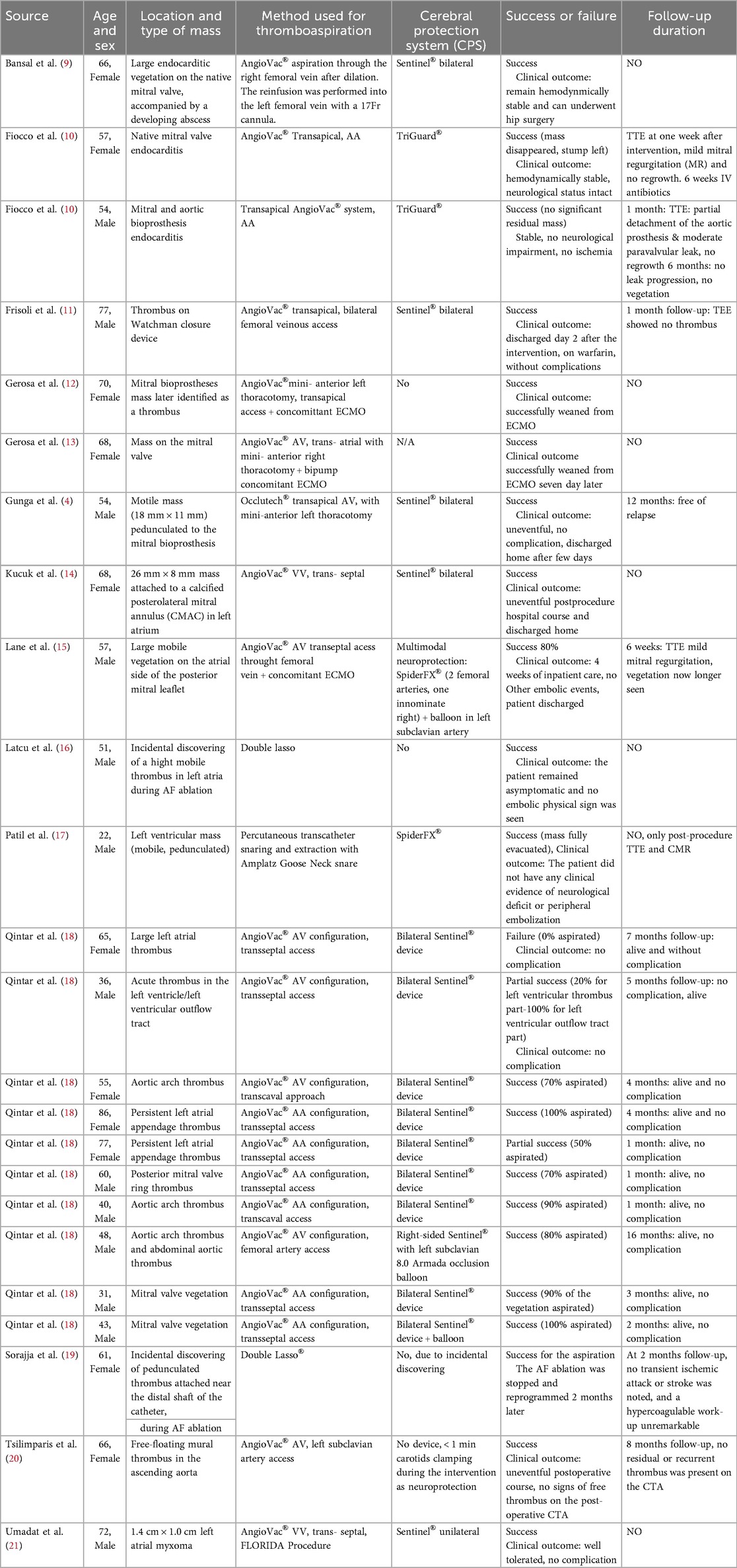 In recent years, thromboaspiration has predominantly been employed in right heart chambers, where it was initially used for the retrieval of thrombi (6–8) However, growing evidence now supports its application in the left heart chambers. In this review, we present 24 cases from 14 published articles (see Table 1), including 10 cases from the series by Qintar et al. The average patient age was 57.7 years, comparable to the 58.3 years reported by Qintar, with a gender distribution of 45% women and 55% men. The majority of patients (20 cases) underwent aspiration using the AngioVac® system (AngioDynamics, Latham, NY, USA), while others were treated with the Lasso® (Biosense Webster Inc., Diamond Bar, CA), Occlutech® (International AB, Helsingborg, Sweden), or Amplatz® Goose Neck Snare systems (Medtronic, Tolochenaz, Switzerland). Neuroprotection devices were used in 19 cases, with the Sentinel® device (Boston Scientific, Marlborough, MA, USA) being most common (15 cases), followed by Triguard® (TriGuard HDH, Keystone Heart, Tampa, FL, USA) (2 cases) and SpiderFX® (Medtronic, Minneapolis, MN) (2 cases). In some instances, no neuroprotection was employed due to incidental thrombus findings or procedural alternatives like carotid clamping. Most cases (21) were performed without ECMO support, with the transseptal route being the most common access approach, followed by transapical, transcaval, and femoral routes. Some cases required a mini-anterior right thoracotomy, while others were managed solely percutaneously. Overall, 22 cases were successful, both in terms of mass removal and complication rates, though potential publication bias in favor of successful outcomes must be considered.