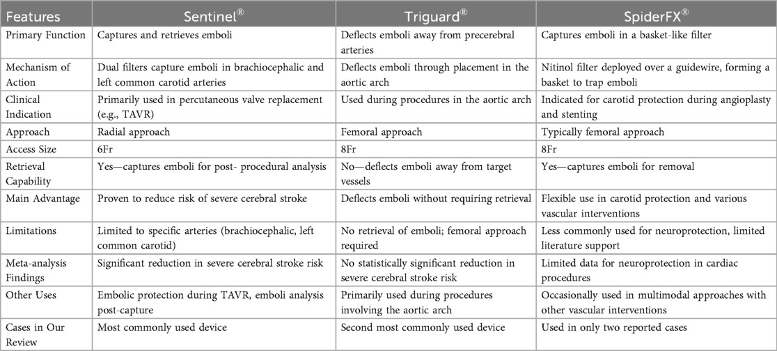 Determining the most effective neuroprotection device for thromboaspiration in left heart cavities is challenging due to several factors (Figure 2). The lack of standardization in filter placement creates variability in outcomes, complicating comparisons between devices and their positioning. Furthermore, there is a notable absence of meta-analyses addressing these filters' efficacy for this specific indication. However, evidence from percutaneous valve replacement procedures suggests a slight advantage of the Sentinel device over the Triguard® (see Table 2). A 2023 meta-analysis (30) found that the Sentinel device significantly reduces the risk of severe cerebral stroke, while the reduction associated with the Triguard® was not statistically significant. Overall, neuroprotection devices did not show statistically significant benefits for cerebral stroke and mortality. However, when evaluated individually, the Sentinel consistently yielded the best outcomes. Other studies have also highlighted the efficacy of both Sentinel and Triguard® in preventing adverse events (24, 26). A distinct advantage of the Sentinel device is its ability to capture and retrieve thrombi, eliminating the immediate embolic threat while allowing for post-procedural pathological analysis. Furthermore, the Sentinel offers the option of a radial approach, in contrast to the more invasive femoral approach required for both Triguard® and SpiderFX® (10, 15).