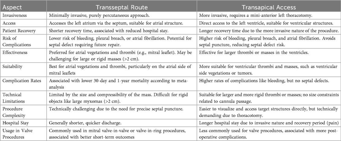 In situations where both the transseptal and transapical approaches are feasible, the decision must consider the potential complications of each approach (see Table 3). A 2023 meta-analysis (33) on the use of these approaches for mitral valve-in-valve or valve-in-ring implantation demonstrated that the transseptal approach was associated with significantly lower 30-day mortality, reduced 1-year mortality risk, and shorter hospital stays compared to the transapical approach. Although the transapical approach carries higher risks, including bleeding, pleural breaches, atrial fibrillation (34, 35) and myocardial tear, it does offer the advantage of avoiding septal puncture, thereby reducing the risk of septal defects and potential future repair (36). Another crucial consideration when selecting the optimal approach is the ability to remove the maximum, if not the entirety, of the mass while preserving the valve's function and integrity. Qintar et al. underline that a successful thromboaspiration can be considered for 70% or more removal of the thrombi or mass (18).