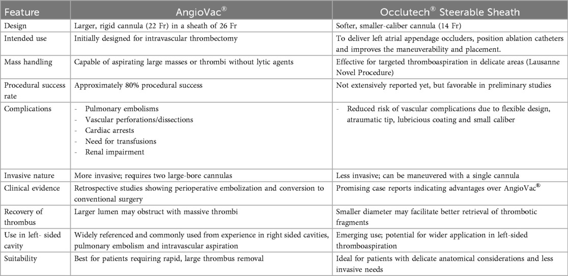 Occlutech represents a softer and smaller-caliber cannula compared to AngioVac®, making it more suitable for directional thrombectomy and targeted thromboaspiration. A 2023 Swedish case report (40) emphasized the advantages of Occlutech® over Angiovac in right heart thromboaspiration. In this case, the smaller 14 Fr Occlutech® cannula outperformed AngioVac®'s larger and more rigid 22 Fr cannula. The rigidity and larger size of AngioVac®, cannulas increase the risk of vascular complications, requiring the use of two large-bore cannulas, which can lead to vessel perforation (41). Moreover, even though AngioVac®'s large catheter is designed to handle massive thrombi, its lumen can still become obstructed by large masses.