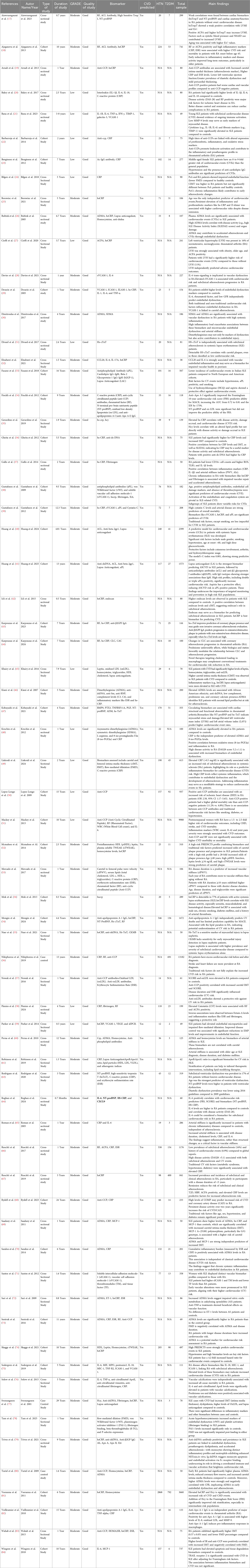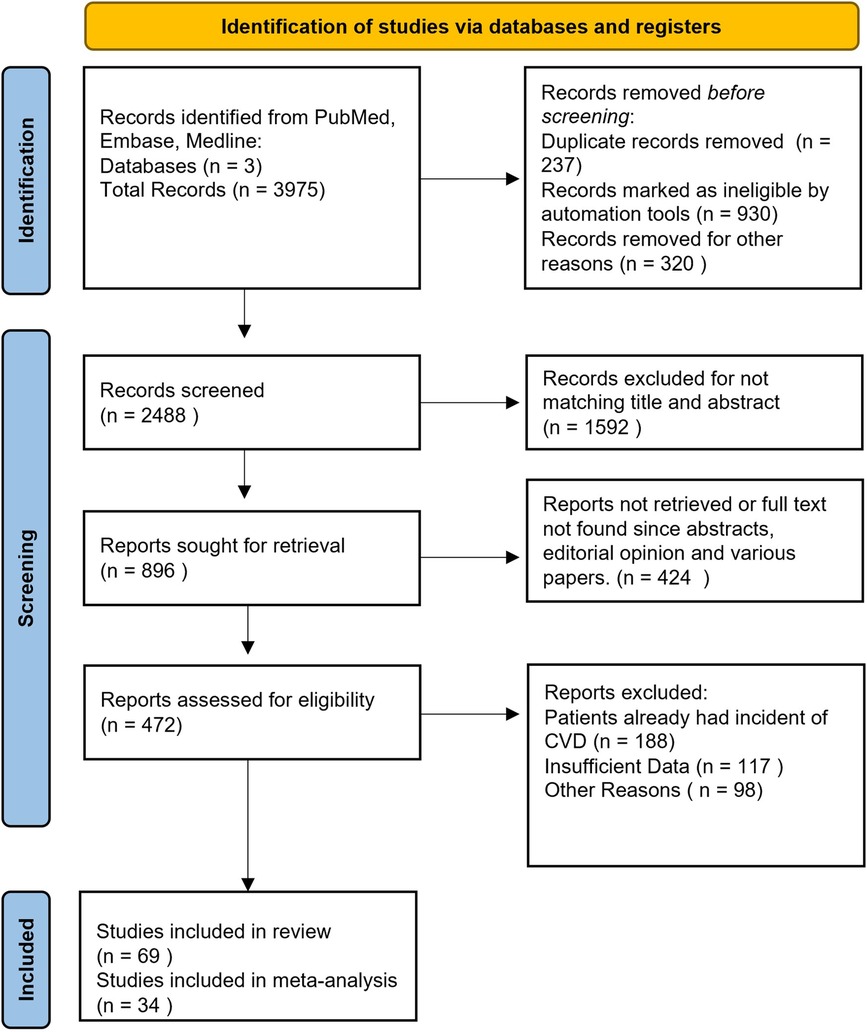 A comprehensive search of PubMed, Embase, and Medline yielded 3,975 records, with 237 duplicates removed prior to screening. Of the remaining 2,488 titles/abstracts screened, 896 full-text articles were retrieved and 472 were ultimately assessed for eligibility. After excluding studies with patients who already had CVD (n = 188) and those with insufficient data (n = 117), 69 studies were included in the review, with 34 contributing to the meta-analysis. Ultimately, studies met all inclusion criteria with a total sample size of 46,493 participants. These included 38 were Case Control Studies, 28 Cohort Studies, 3 case-control studies (17–84). Most of the studies were rated Moderate in GRADE analysis and the quality of the studies were Good. The Biomarkers most commonly reported in these studies were hsCRP (n = 24), RF (n = 6), IL-6 (n = 6), Anti-CCP (n = 6), ADMA (n = 6), Hcy (n = 5), sVCAM-1 (n = 5), NT-proBNP (n = 4), APL (n = 4), Fibrinogen (n = 4), TNF-alpha (n = 3) and ACL (n = 2). Type of Study, Duration of Study, GRADE, Quality of Study, Biomarker, whether or not CVD Predicted, HTN, T2DM, Total Sample Population and what were the Main Findings are tabulated in Table 1.