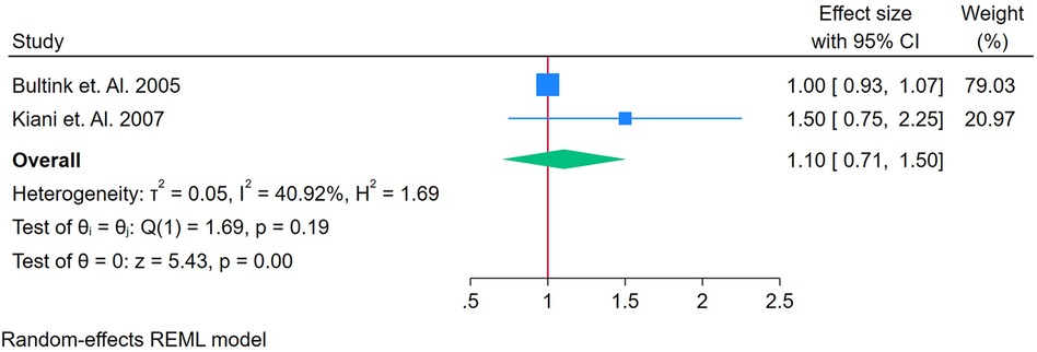 ![Forest plot showing effect sizes and confidence intervals for two studies by Bultink et al. (2005) and Kiani et al. (2007). Overall effect size is 1.10 with 95% CI [0.71, 1.50]. Heterogeneity metrics include T-squared equals 0.05, I-squared equals 40.92%, and H-squared equals 1.69. Statistical tests show Q(1) equals 1.69, p equals 0.19, and z equals 5.43, p equals 0.00.](https://www.frontiersin.org/files/Articles/1598590/fcvm-12-1598590-HTML-r1/image_m/fcvm-12-1598590-g009.jpg)